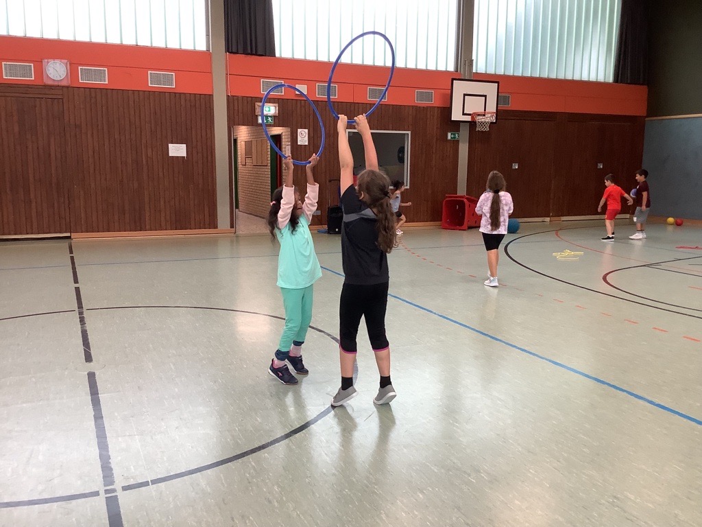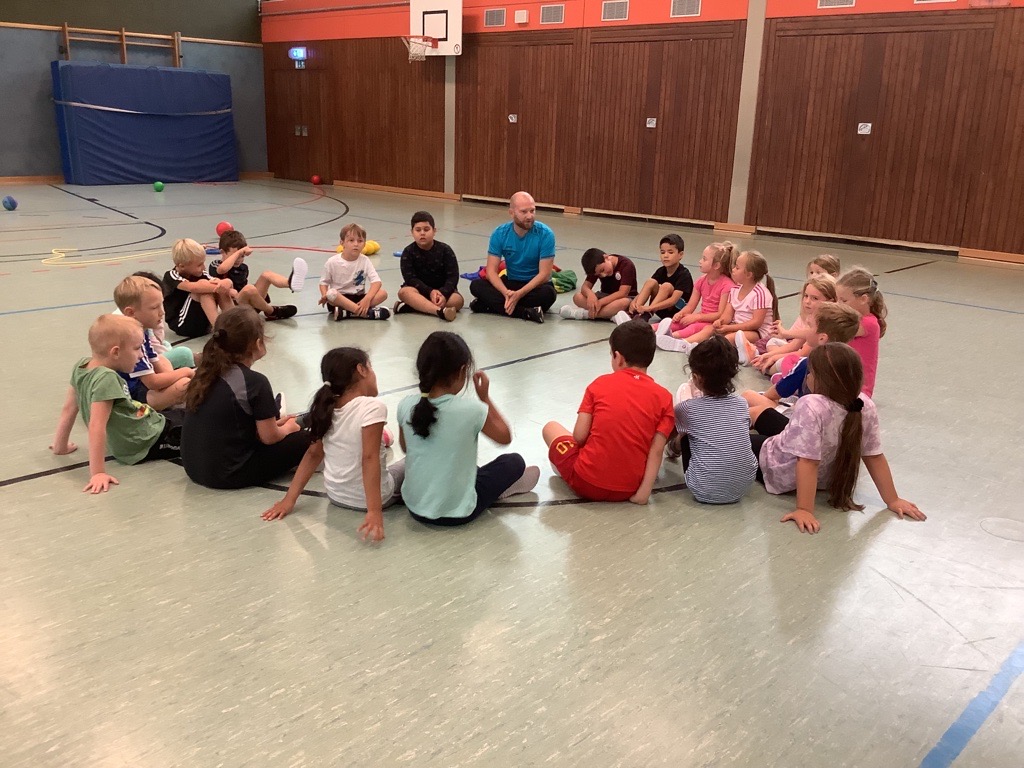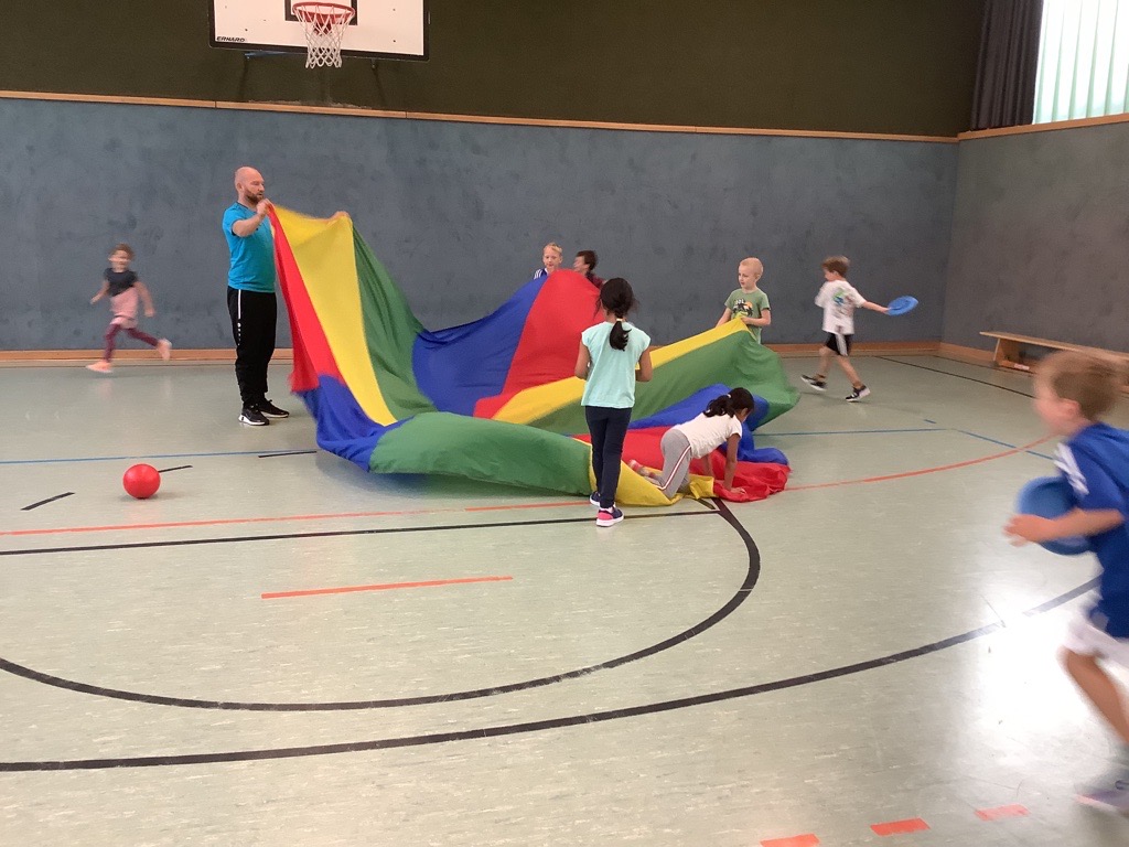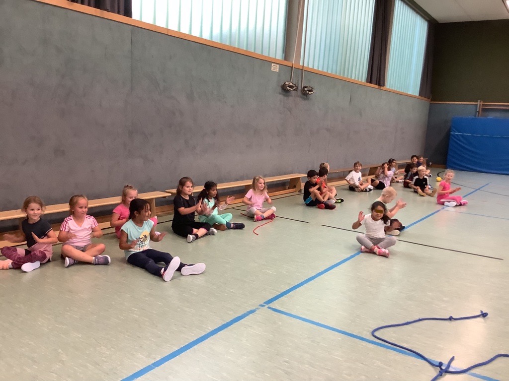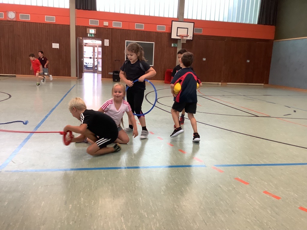 Die Kinder der ersten Klasse hatten die Möglichkeit sich an verschiedenen Materialien in der Turnhalle zu bedienen, mit ihnen zu experimentieren und zu spielen. Es gab Ringe, Reifen, Bälle, und ein Schwungtuch. Viele Kinder hatten ganz kreative Ideen die Gegenstände zu nutzen und damit neue Spiele zu erfinden. Besonders attraktiv war das knallbunte Schwungtuch. Das Abspielen von Kinderliedern hat der Sportstunde den letzten Schliff gegeben und manche Kinder haben gerne mitgesungen. Zum Abschluss wurde noch ein gemeinschaftliches Spiel gespielt, bei dem die Erstklässler bei den entsprechenden Kommandos einen „Kaffeeklatsch“ auf dem Boden hielten oder wie „Kaugummi“ an der Wand festklebten.