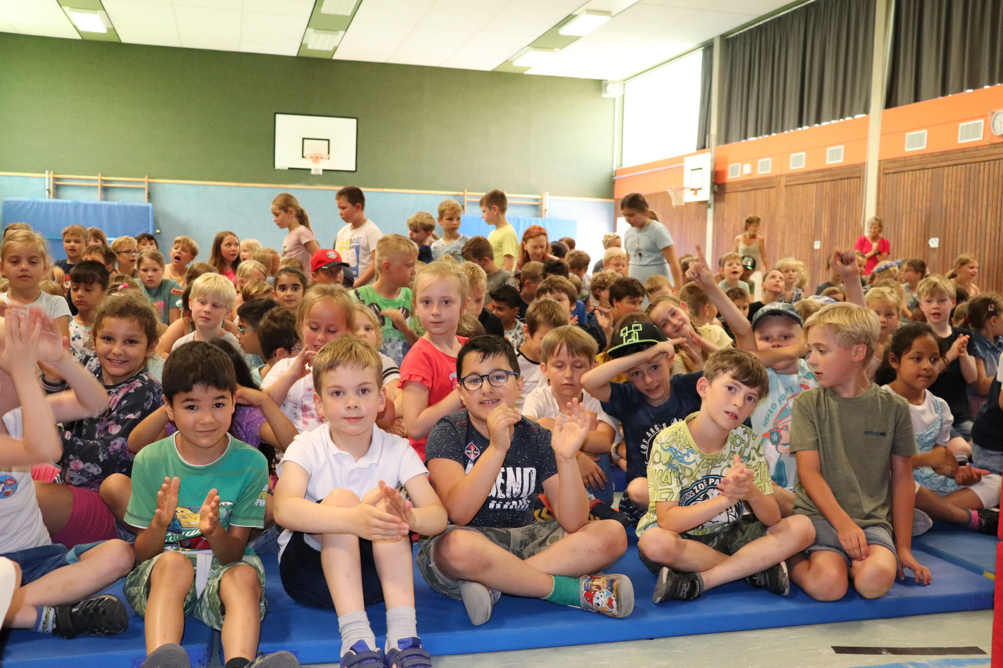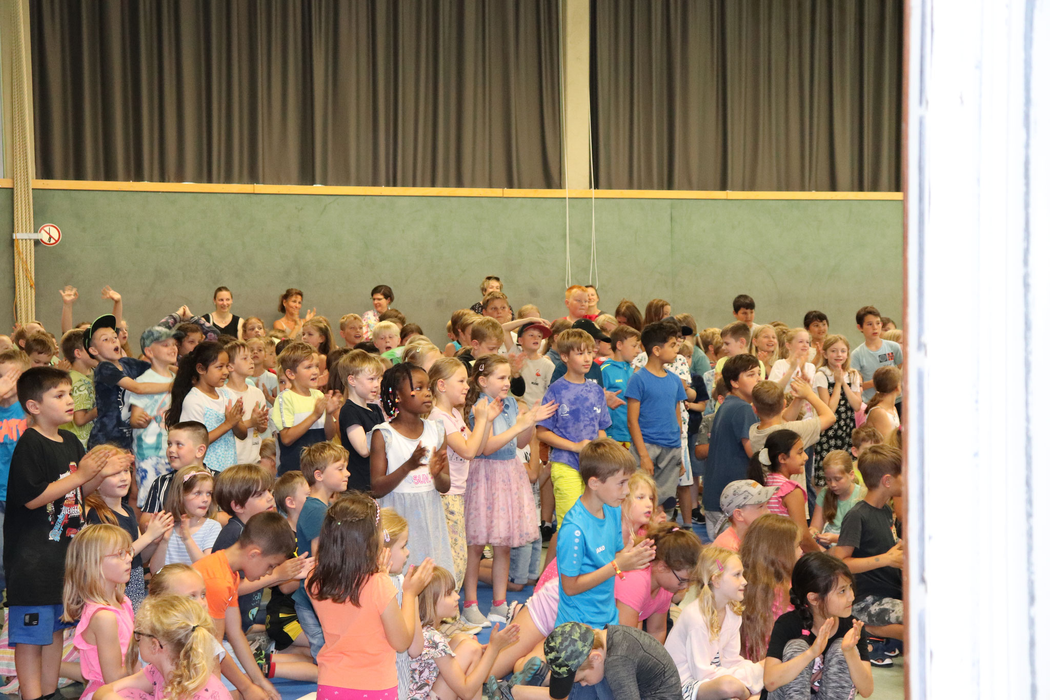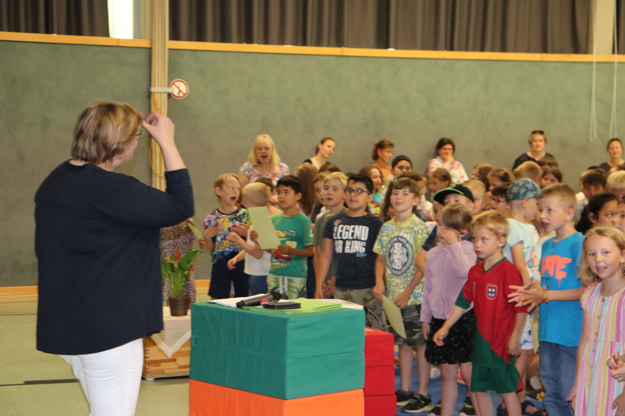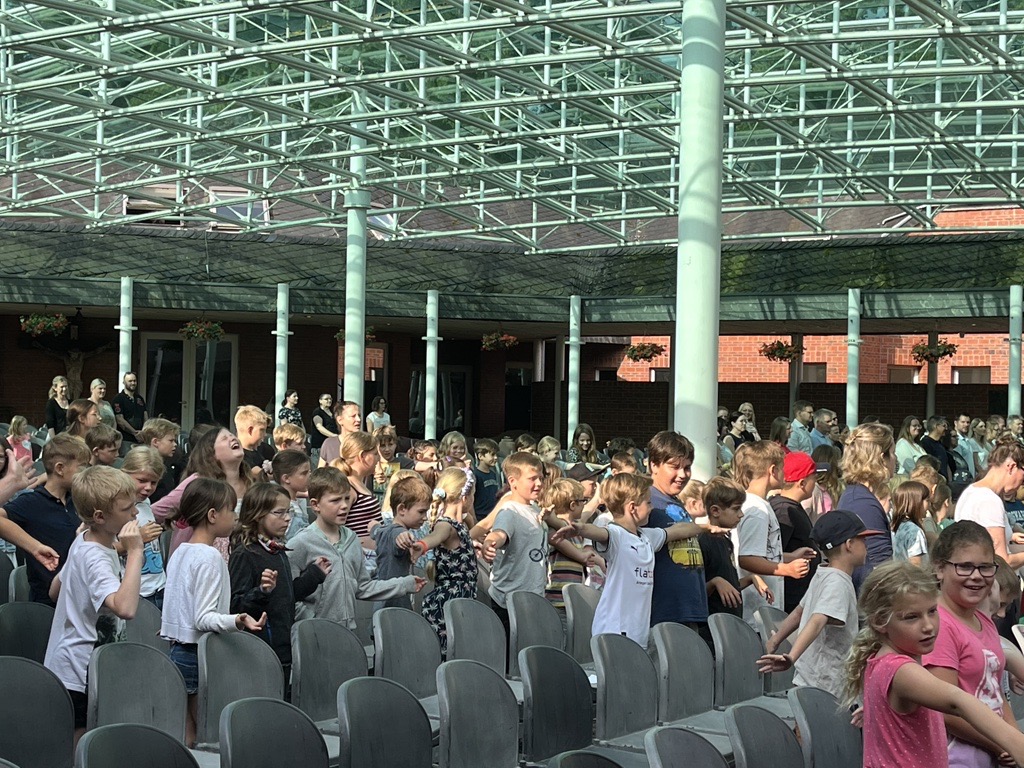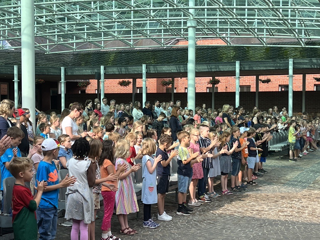 Den letzten Schultag vor den Sommerferien begannen wir mit allen Kindern im Forum Pax Christi mit einem Schulgottesdienst zum Thema "Glück gehabt - Gott sei Dank!" Schön, dass diesmal auch so viele Eltern teilnehmen konnten. Gemeinsam ging es dann Richtung Schule. Auf dem Schulhof zogen die Viertklässler dann erstmals zum Lied "Ein Hoch auf uns" durch ein großes Spalier in die Turnhalle ein. Im Rahmen einer kleinen Abschlussfeier bekamen die Kinder ihre Abschlusszeugnisse überreicht. Alle guten Wünsche wurden dann per Luftballon in Richtung Himmel geschickt. Im Anschluss wurden alle Erst-, Zweit- und Drittklässler in die Ferien verabschiedet. Ebenfalls in der Turnhalle bekamen die besten Sportlerinnen und Sportler der Bundesjugendspiele ihre Ehrenurkunden bzw. die Urkunden für die 400- und 800-Meter-Läufe. Zum Abschluss sangen alle lautstark das neu eingeübte Kinderrechtelied.