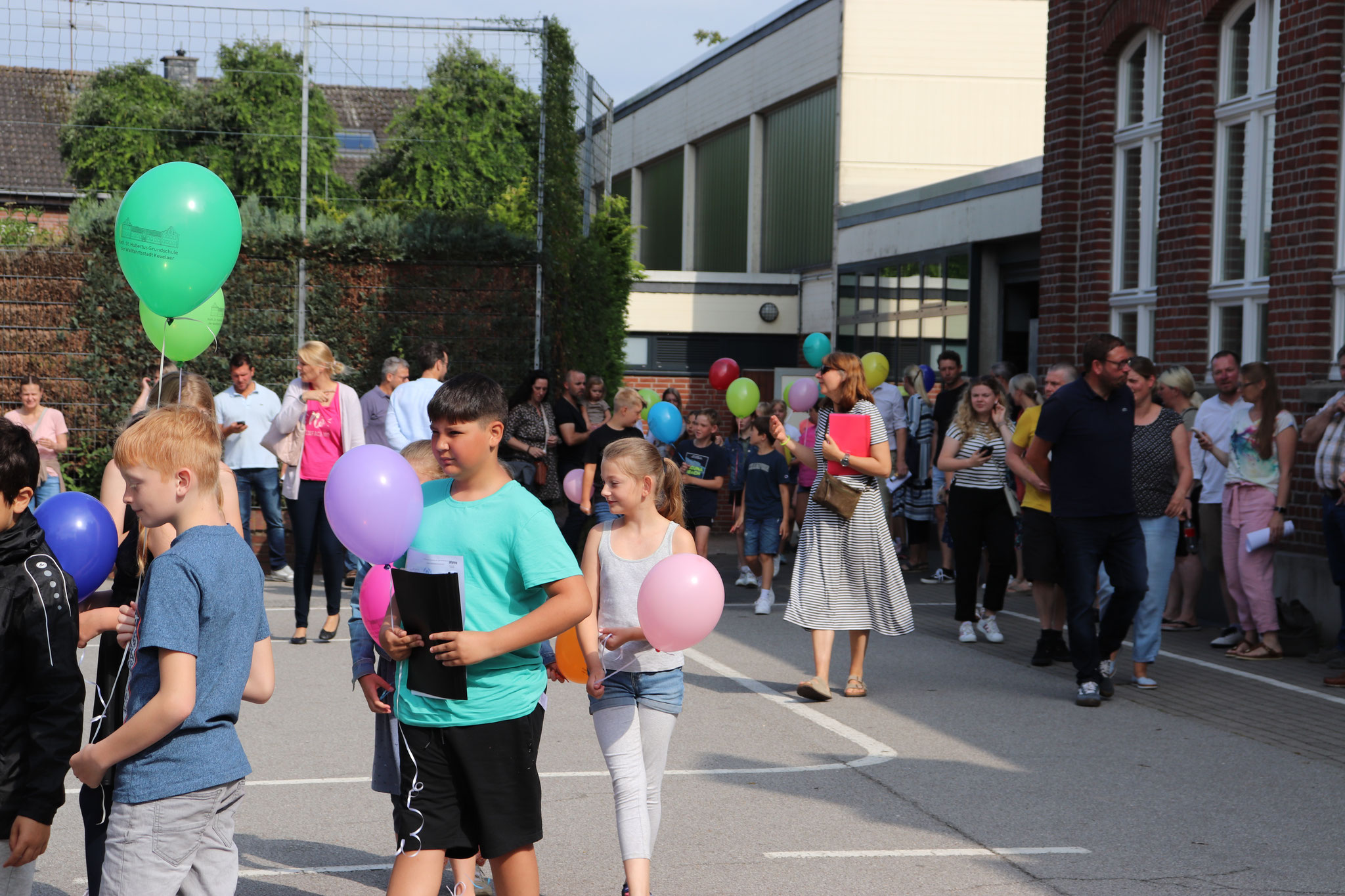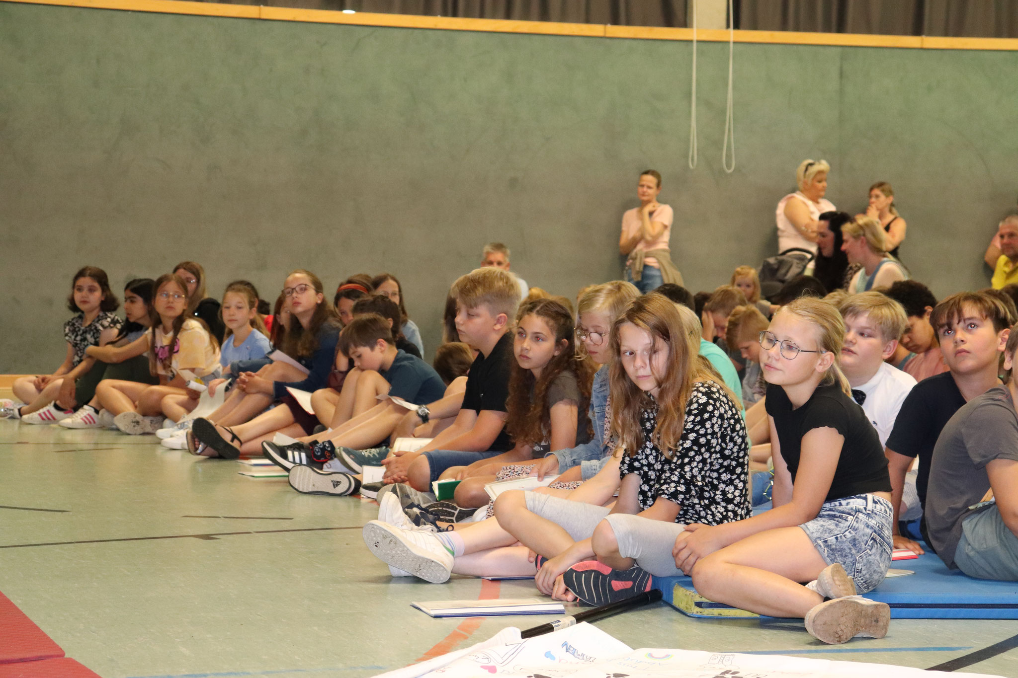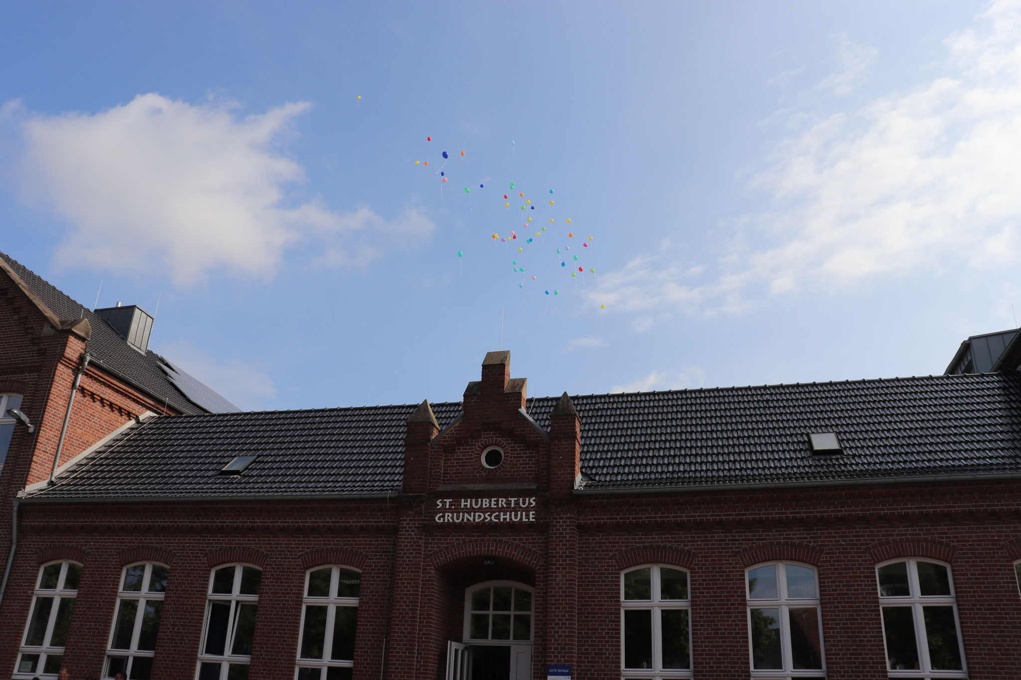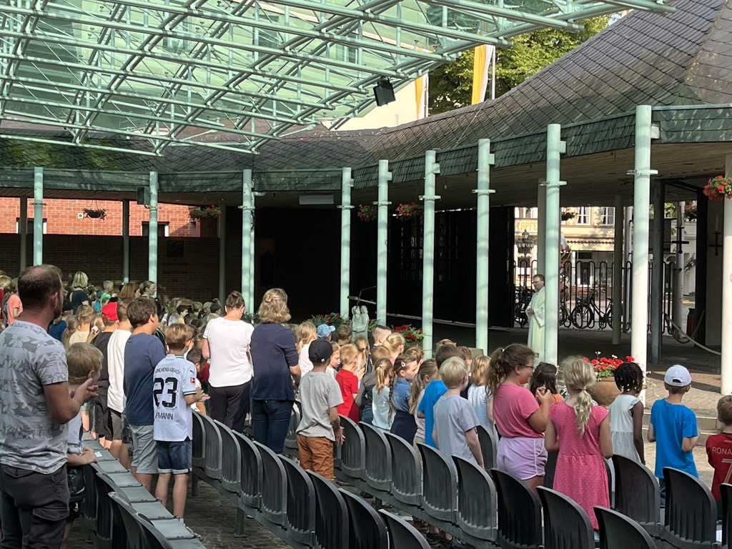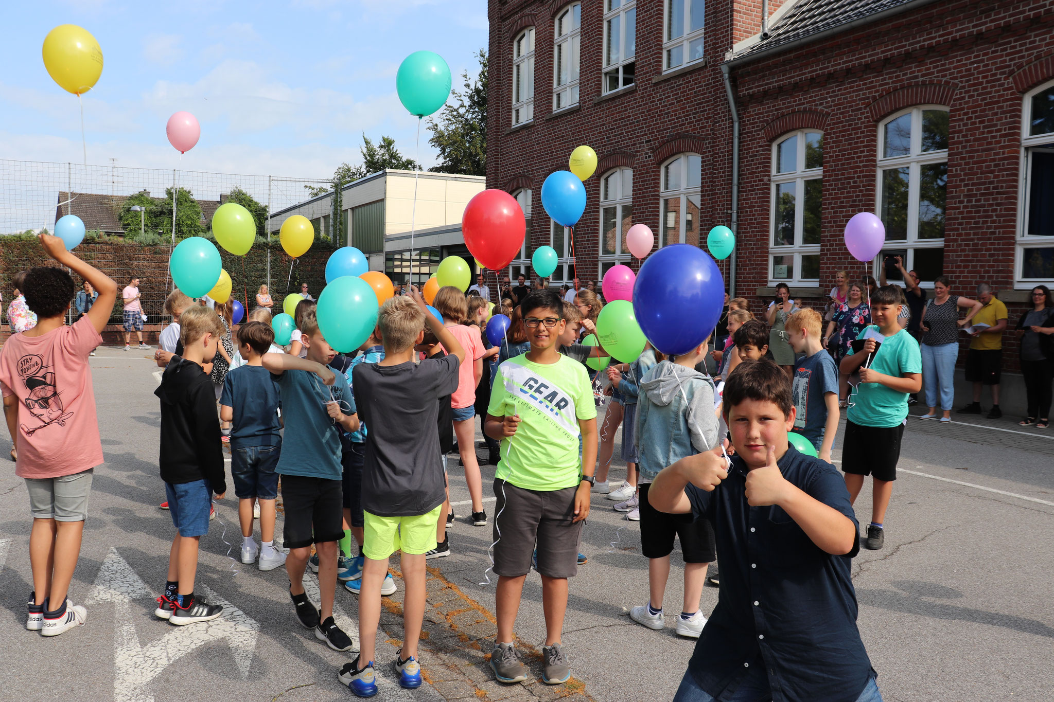 Den letzten Schultag vor den Sommerferien begannen wir mit allen Kindern im Forum Pax Christi mit einem Schulgottesdienst zum Thema "Glück gehabt - Gott sei Dank!" Schön, dass diesmal auch so viele Eltern teilnehmen konnten. Gemeinsam ging es dann Richtung Schule. Auf dem Schulhof zogen die Viertklässler dann erstmals zum Lied "Ein Hoch auf uns" durch ein großes Spalier in die Turnhalle ein. Im Rahmen einer kleinen Abschlussfeier bekamen die Kinder ihre Abschlusszeugnisse überreicht. Alle guten Wünsche wurden dann per Luftballon in Richtung Himmel geschickt. Im Anschluss wurden alle Erst-, Zweit- und Drittklässler in die Ferien verabschiedet. Ebenfalls in der Turnhalle bekamen die besten Sportlerinnen und Sportler der Bundesjugendspiele ihre Ehrenurkunden bzw. die Urkunden für die 400- und 800-Meter-Läufe. Zum Abschluss sangen alle lautstark das neu eingeübte Kinderrechtelied.