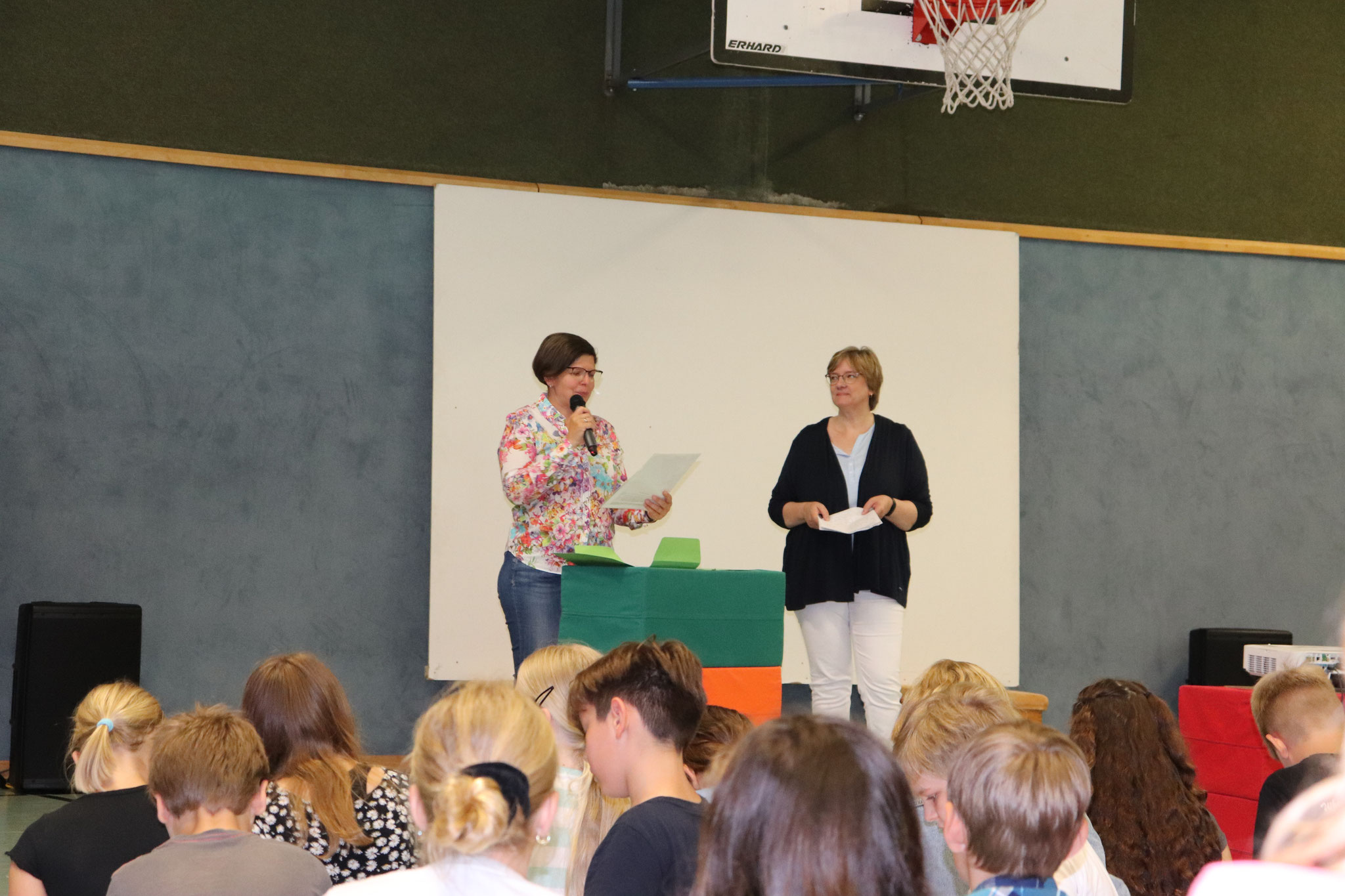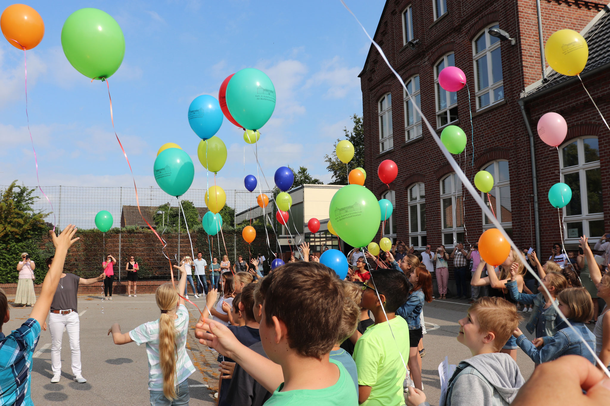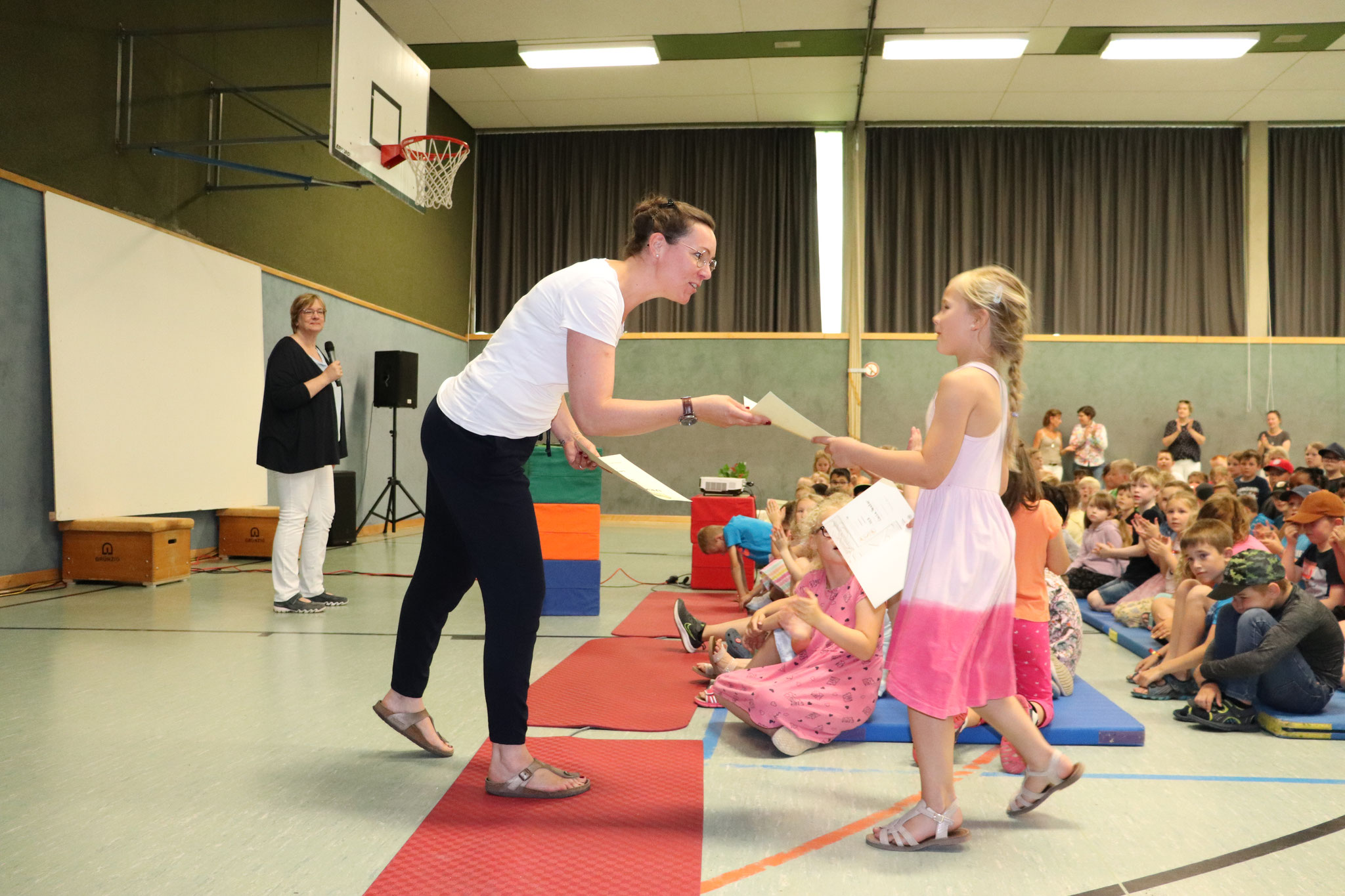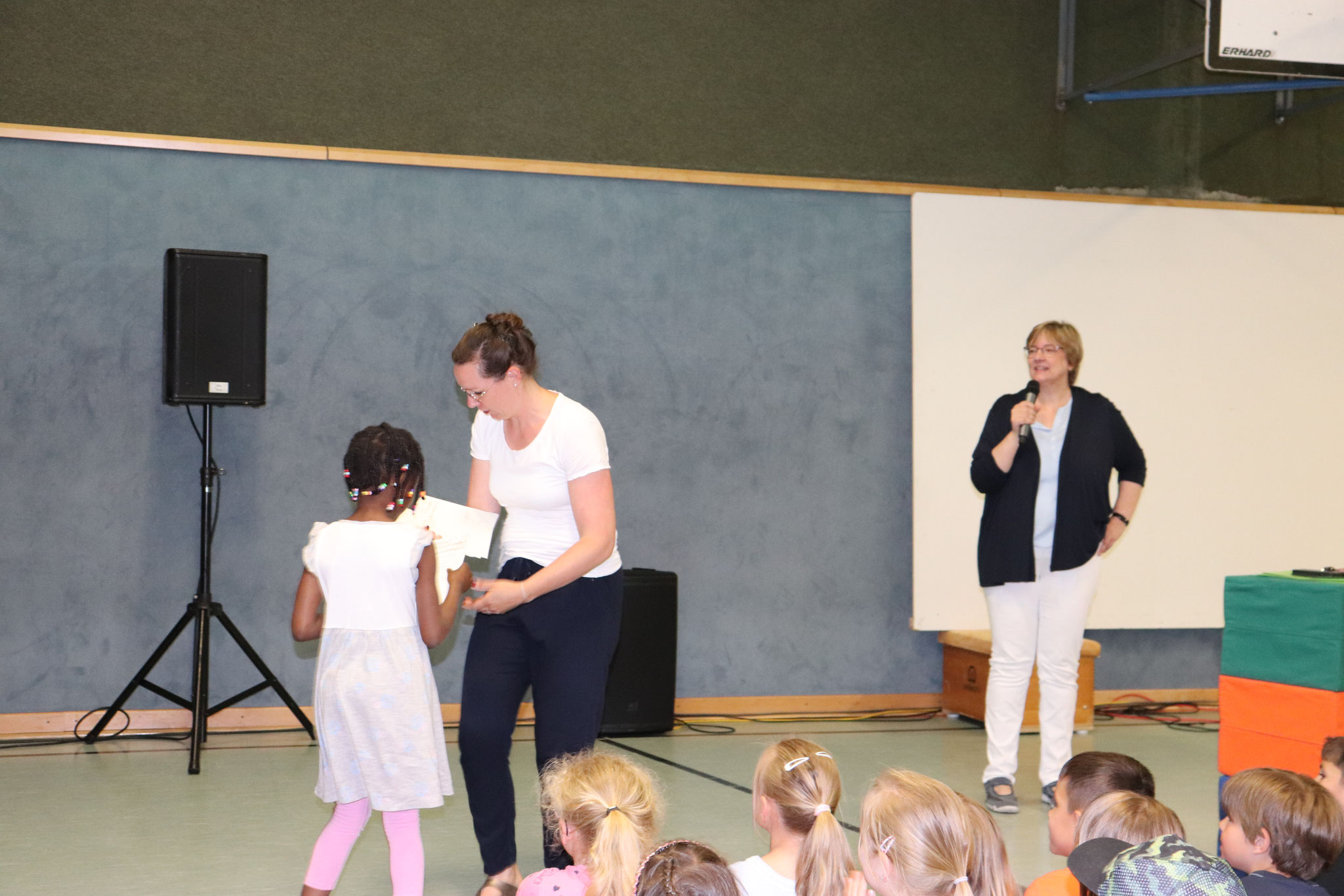 Den letzten Schultag vor den Sommerferien begannen wir mit allen Kindern im Forum Pax Christi mit einem Schulgottesdienst zum Thema "Glück gehabt - Gott sei Dank!" Schön, dass diesmal auch so viele Eltern teilnehmen konnten. Gemeinsam ging es dann Richtung Schule. Auf dem Schulhof zogen die Viertklässler dann erstmals zum Lied "Ein Hoch auf uns" durch ein großes Spalier in die Turnhalle ein. Im Rahmen einer kleinen Abschlussfeier bekamen die Kinder ihre Abschlusszeugnisse überreicht. Alle guten Wünsche wurden dann per Luftballon in Richtung Himmel geschickt. Im Anschluss wurden alle Erst-, Zweit- und Drittklässler in die Ferien verabschiedet. Ebenfalls in der Turnhalle bekamen die besten Sportlerinnen und Sportler der Bundesjugendspiele ihre Ehrenurkunden bzw. die Urkunden für die 400- und 800-Meter-Läufe. Zum Abschluss sangen alle lautstark das neu eingeübte Kinderrechtelied.