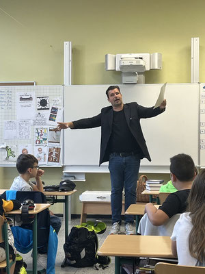 Am 28.09.2023 war der Autor Armin Pongs in unseren vierten Klassen zu Gast. Er las sehr lebendig und packend aus seinem Buch „Der magische Kalender“ vor. Anschließend gab es eine Fragerunde und sogar ein besonderes Geschenk… einen Stein vom letzten Vulkanausbruch in Deutschland. Mit dabei war außerdem der Illustrator der Bücher, Herr Saha, der während der Lesungen die jeweiligen Klassentiere zeichnete und damit große Begeisterung auslöste. Es war eine tolle Veranstaltung!