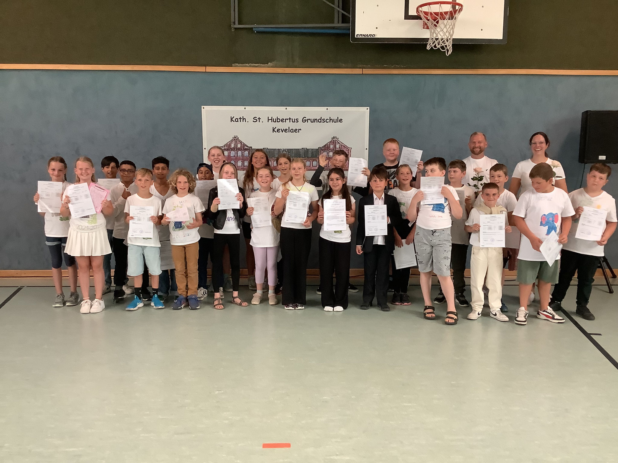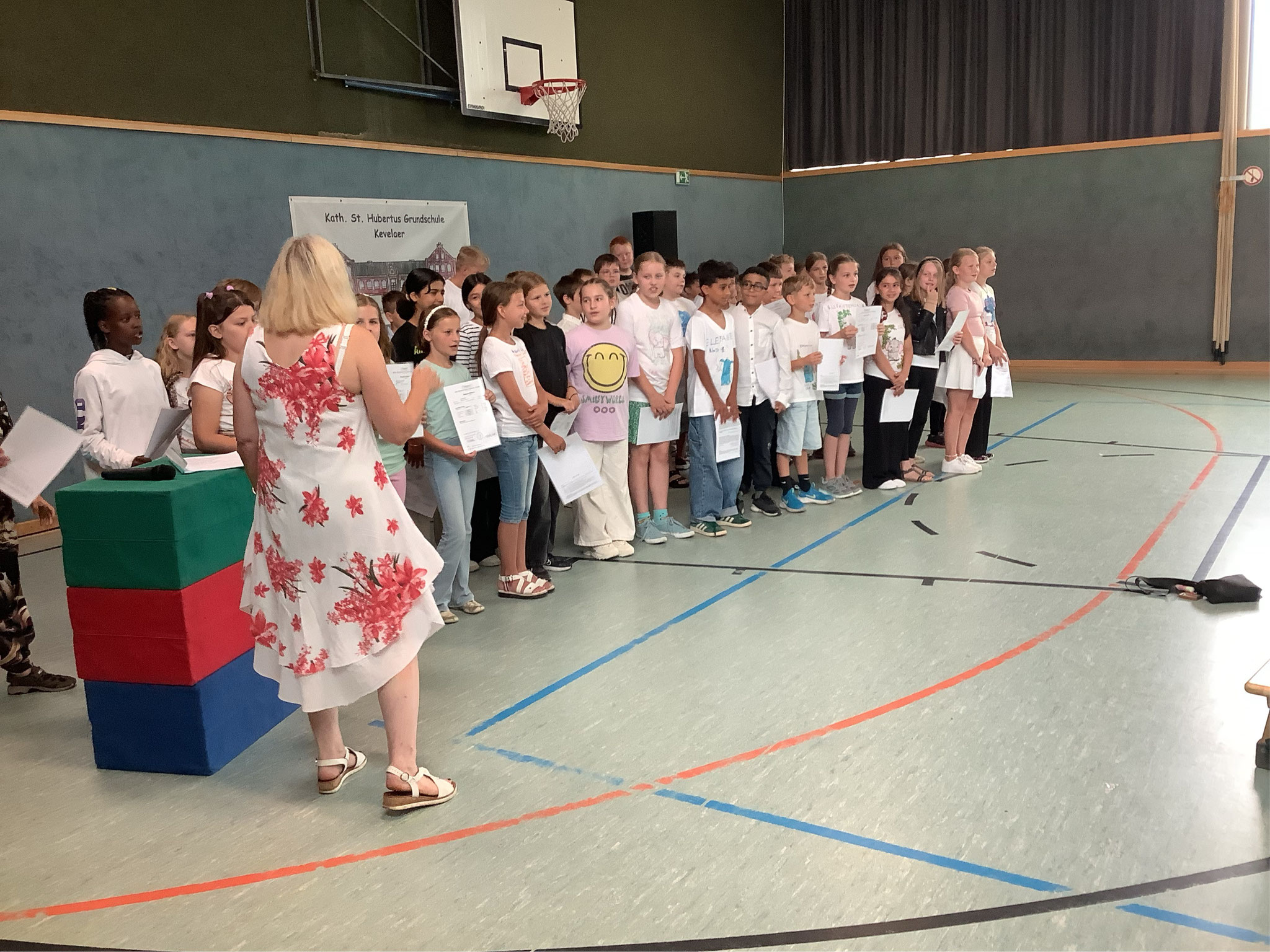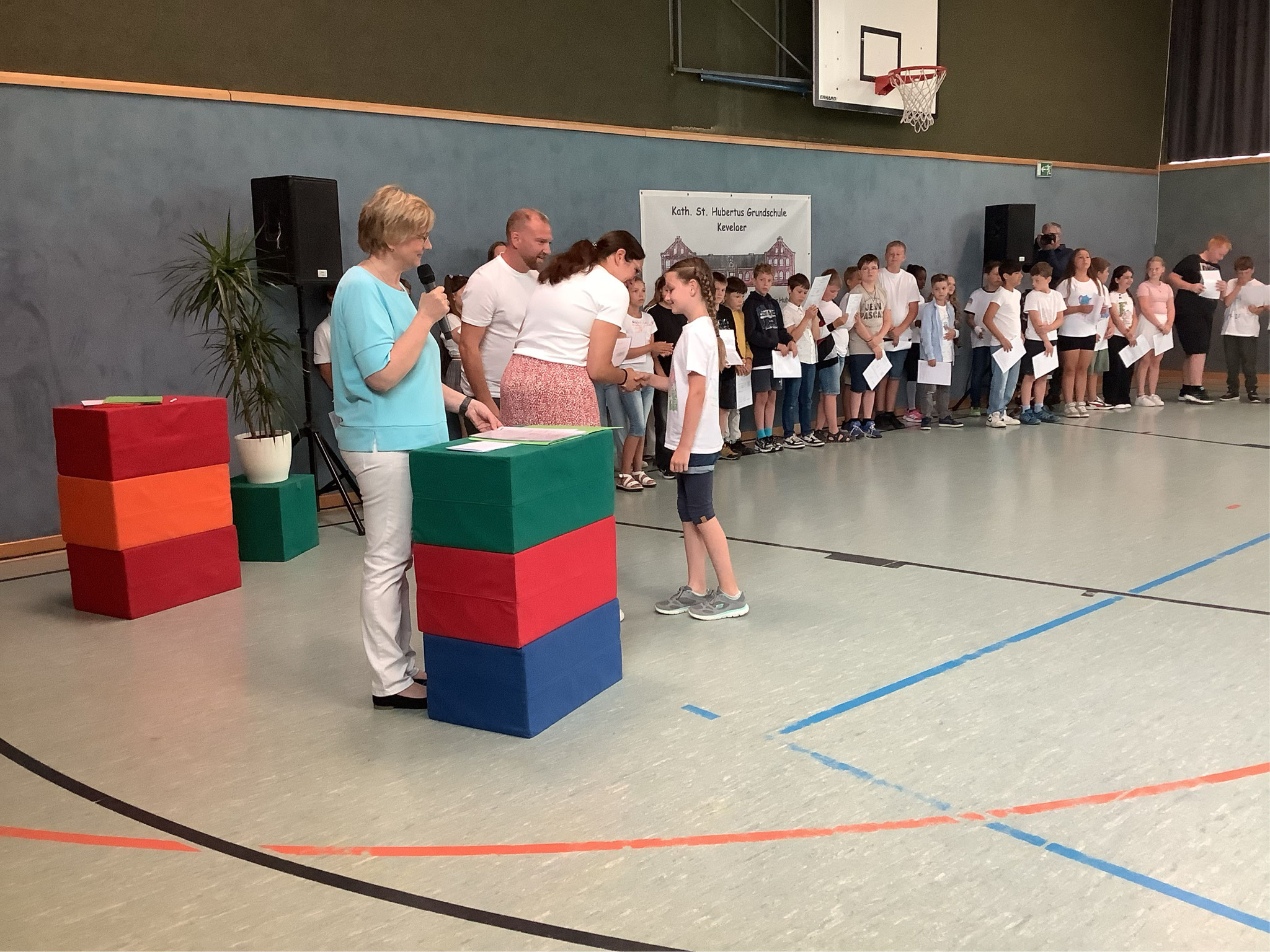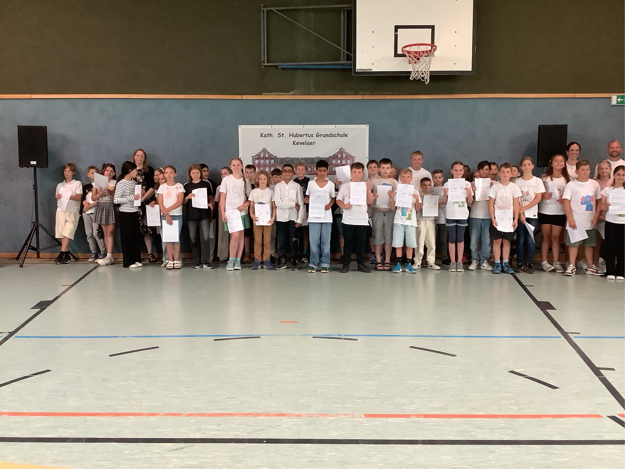 In der letzten Schulwoche haben wir unsere zwei 4. Klassen verabschiedet. Am Dienstag, dem 8.7.2025 gab es einen ökumenischen Wortgottesdienst in der Turnhalle. Vielen Dank an Frau Dembek und Herrn Ingendae für die Gestaltung des Gottesdienstes. Am letzten Schultag, Freitag, dem 11.7. war dann die feierliche Übergabe der Abschlusszeugnisse ebenfalls in der Turnhalle. Eltern und Familienangehörige waren herzlich eingeladen und sichtlich stolz auf unsere Viertklässlerinnen und Viertklässler. Wir wünschen allen Hubertuskindern unserer Entlassklassen viel Erfolg für ihren weiteren Weg!