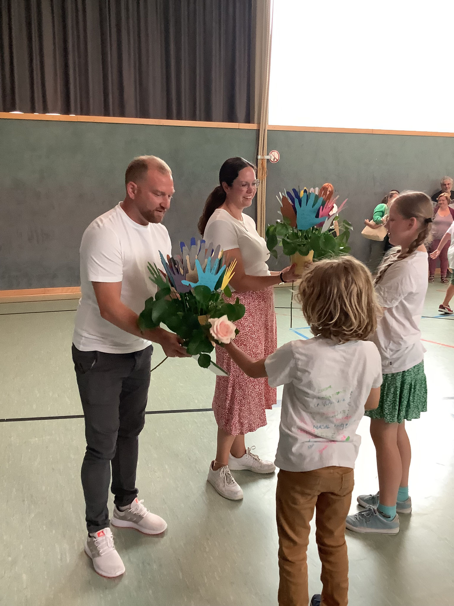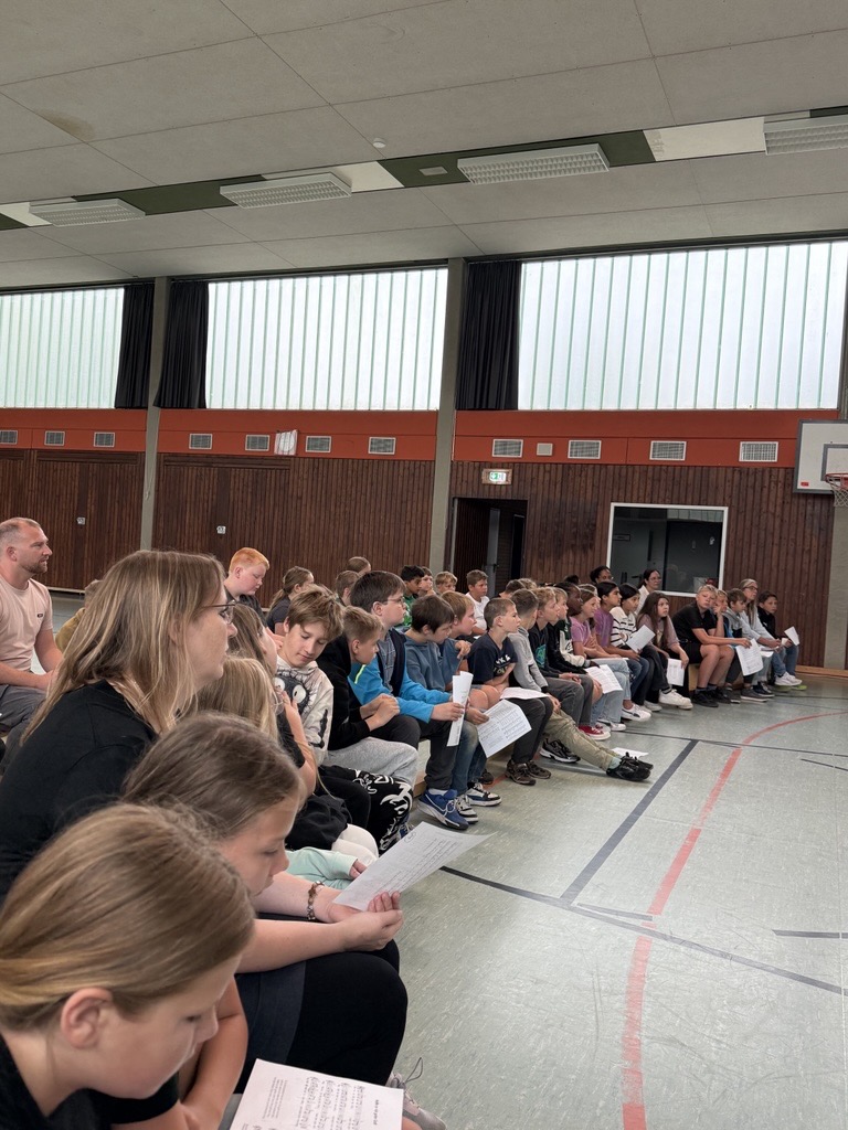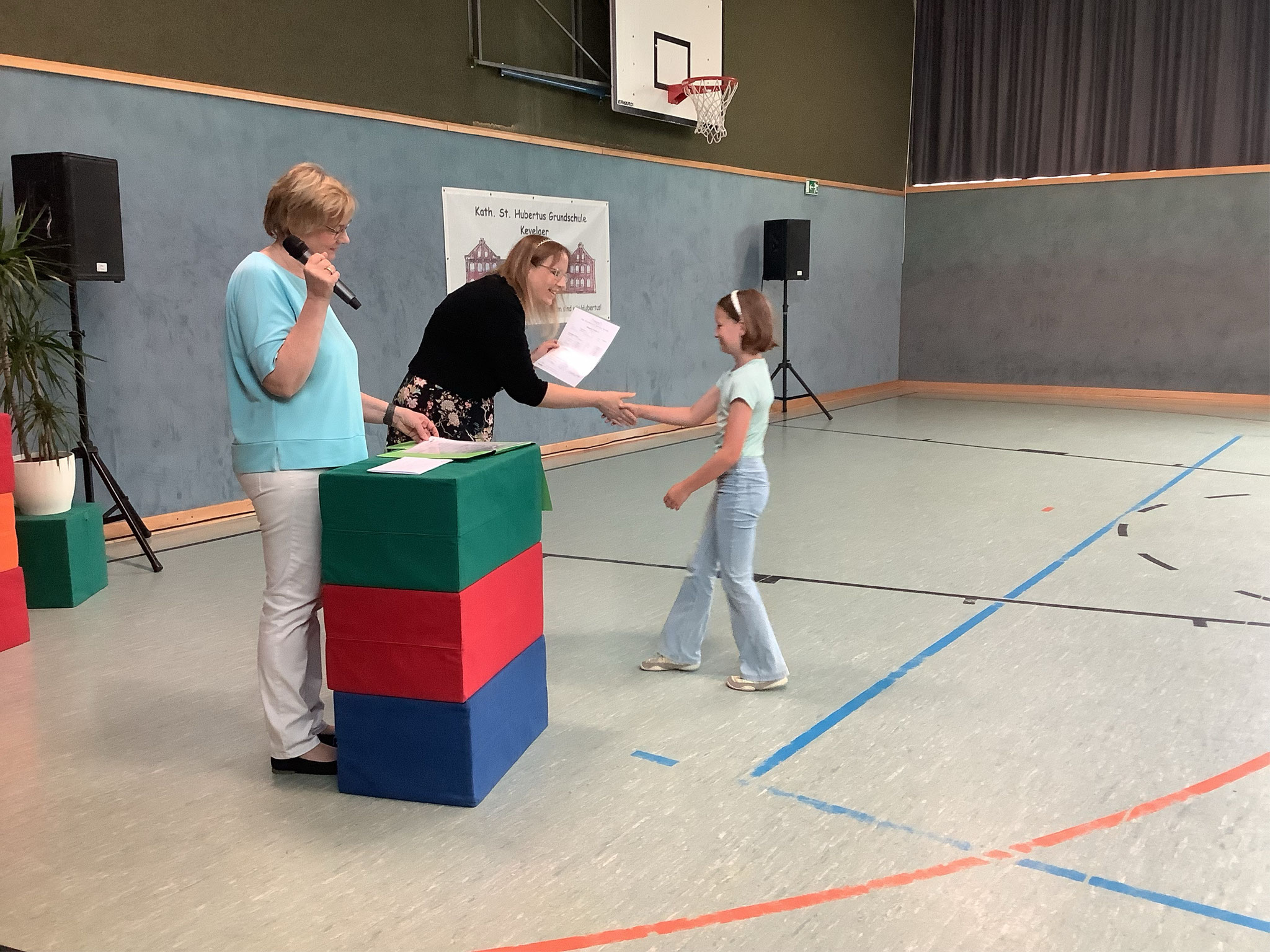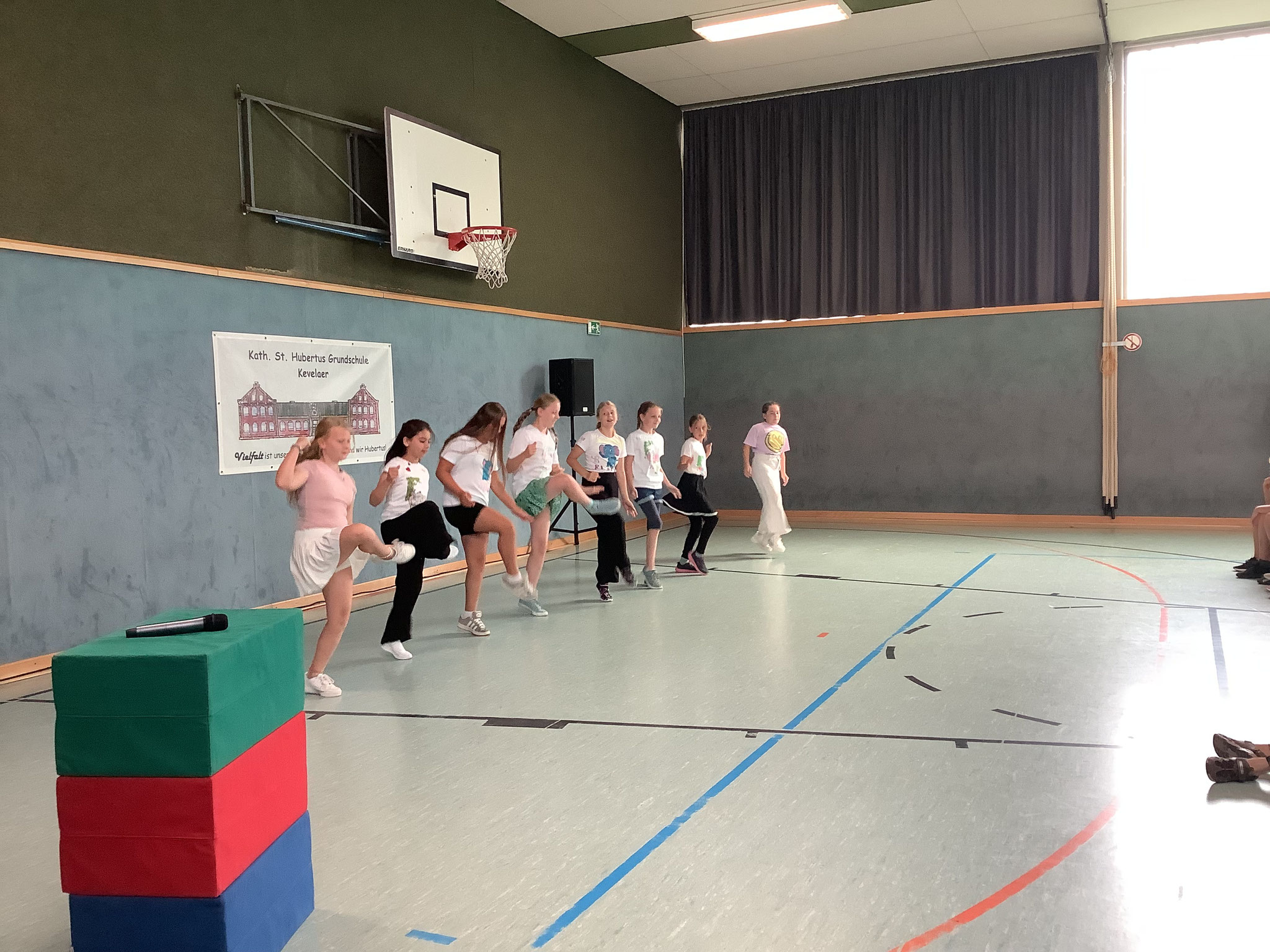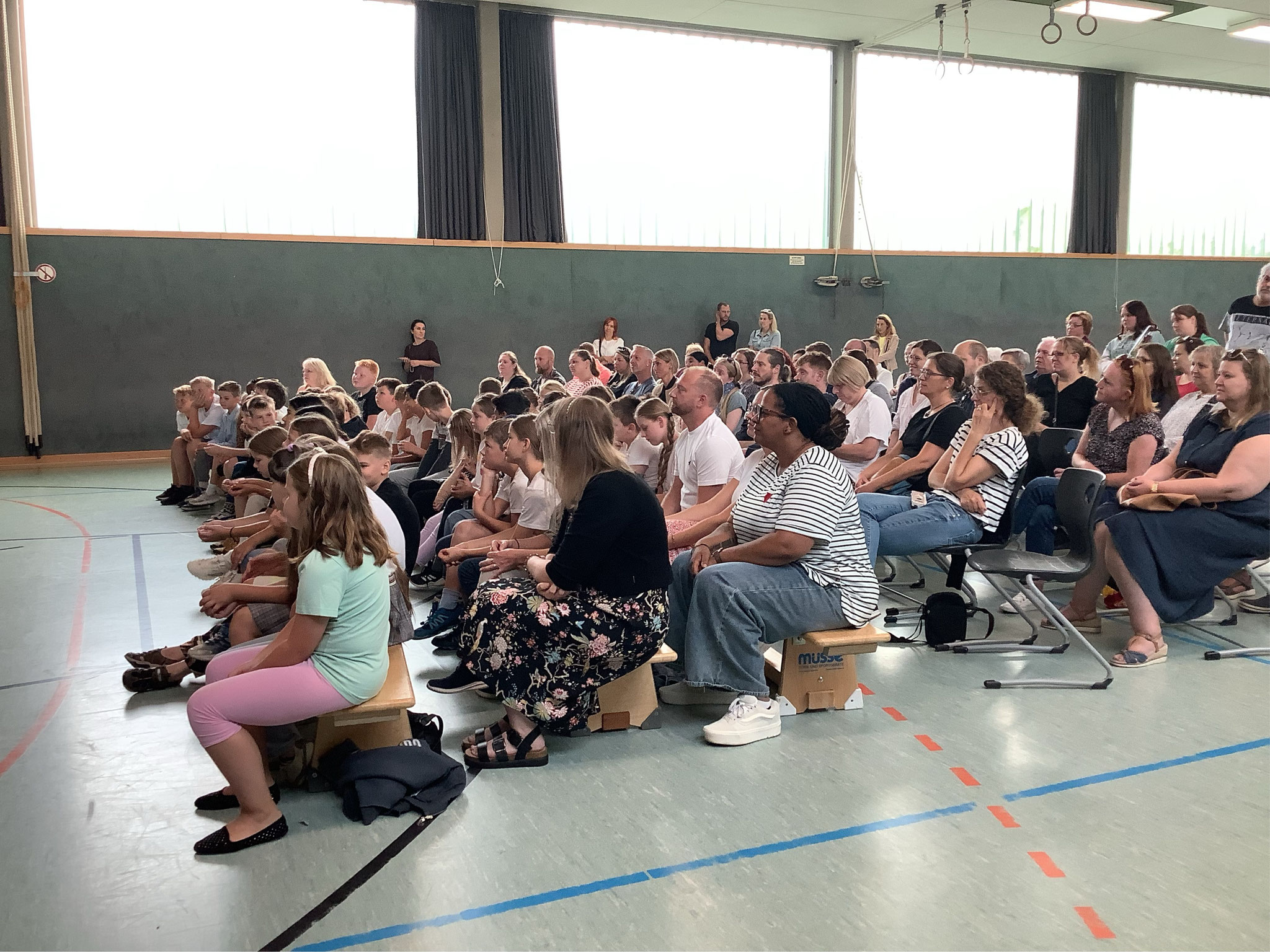 In der letzten Schulwoche haben wir unsere zwei 4. Klassen verabschiedet. Am Dienstag, dem 8.7.2025 gab es einen ökumenischen Wortgottesdienst in der Turnhalle. Vielen Dank an Frau Dembek und Herrn Ingendae für die Gestaltung des Gottesdienstes. Am letzten Schultag, Freitag, dem 11.7. war dann die feierliche Übergabe der Abschlusszeugnisse ebenfalls in der Turnhalle. Eltern und Familienangehörige waren herzlich eingeladen und sichtlich stolz auf unsere Viertklässlerinnen und Viertklässler. Wir wünschen allen Hubertuskindern unserer Entlassklassen viel Erfolg für ihren weiteren Weg!
