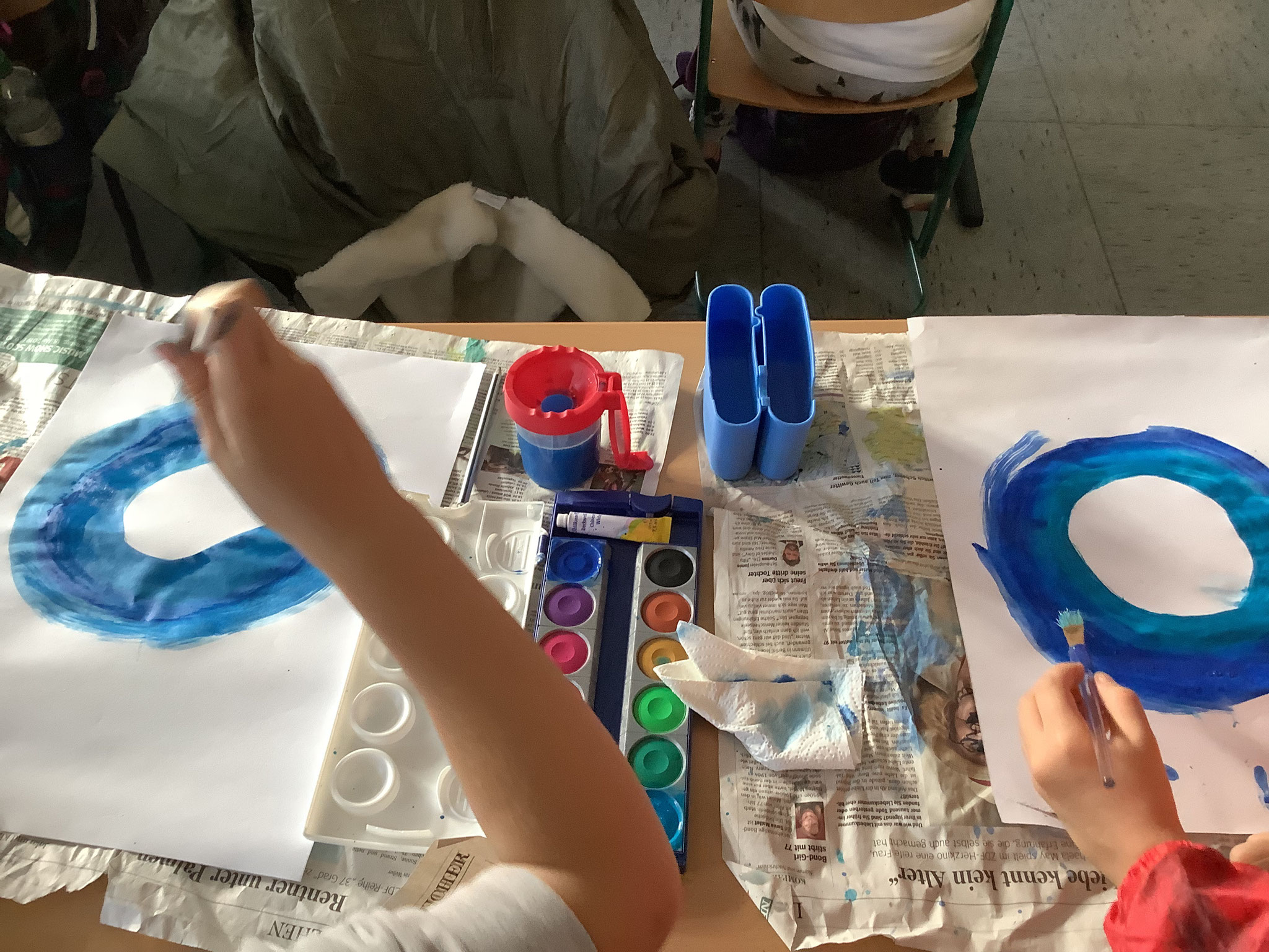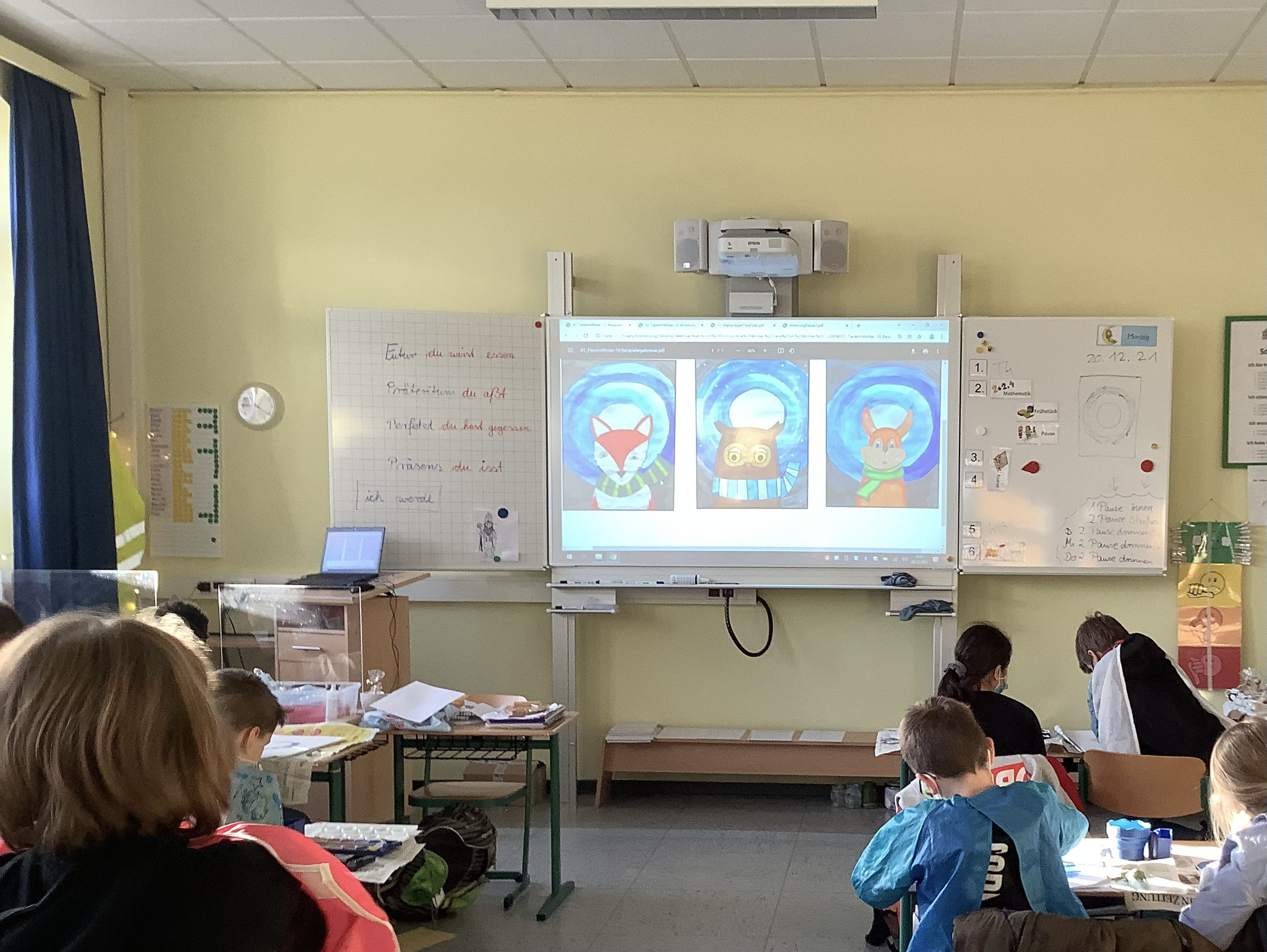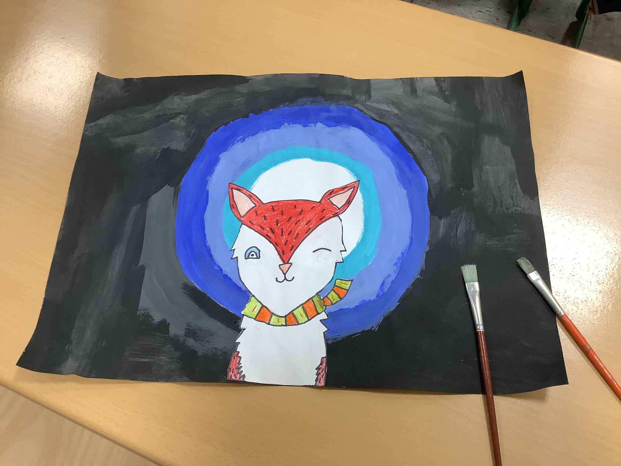 In der letzten Unterrichtswoche vor den Weihnachtsferien haben wir schöne Bilder mit Wasserfarbe gestaltet. Die Kinder haben unterschiedliche blaue Farbtöne und schwarze Farbe benutzt um den Nachthimmel rund um den Mond darzustellen. Nach einer Zeichenanleitung haben sie Tiere gezeichnet, farbig gestaltet und im Anschluss daran die Konturen mit einem schwarzen Filzstift umrandet. Die Kinder sind sehr stolz auf ihre Ergebnisse.