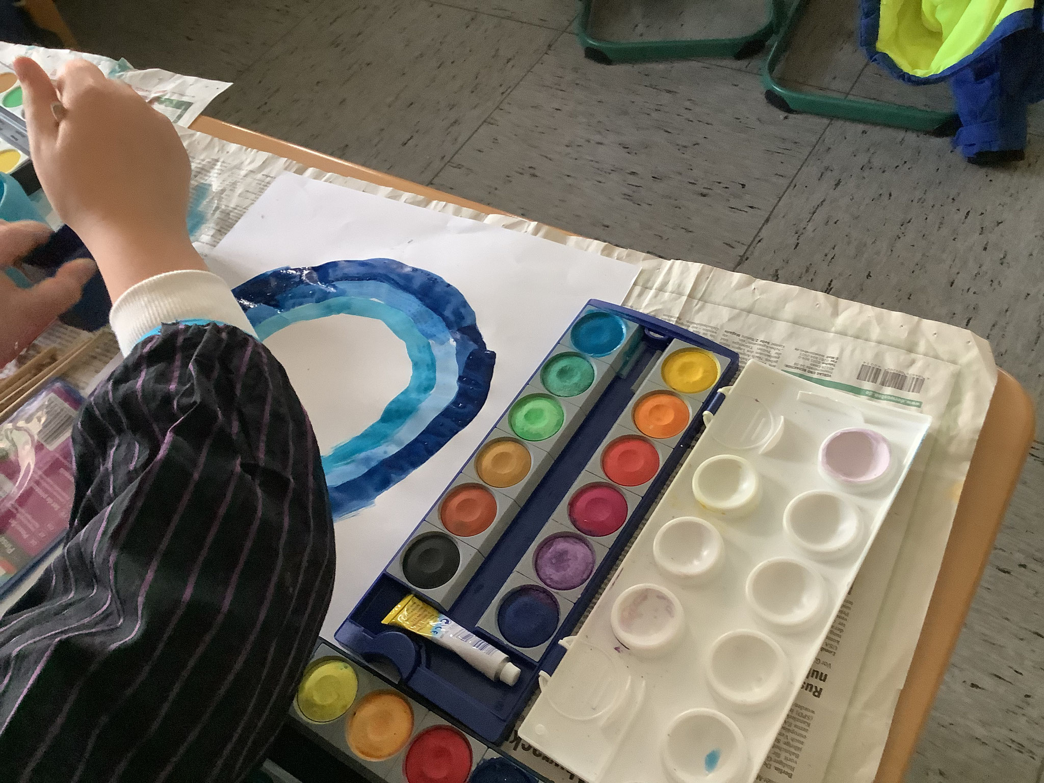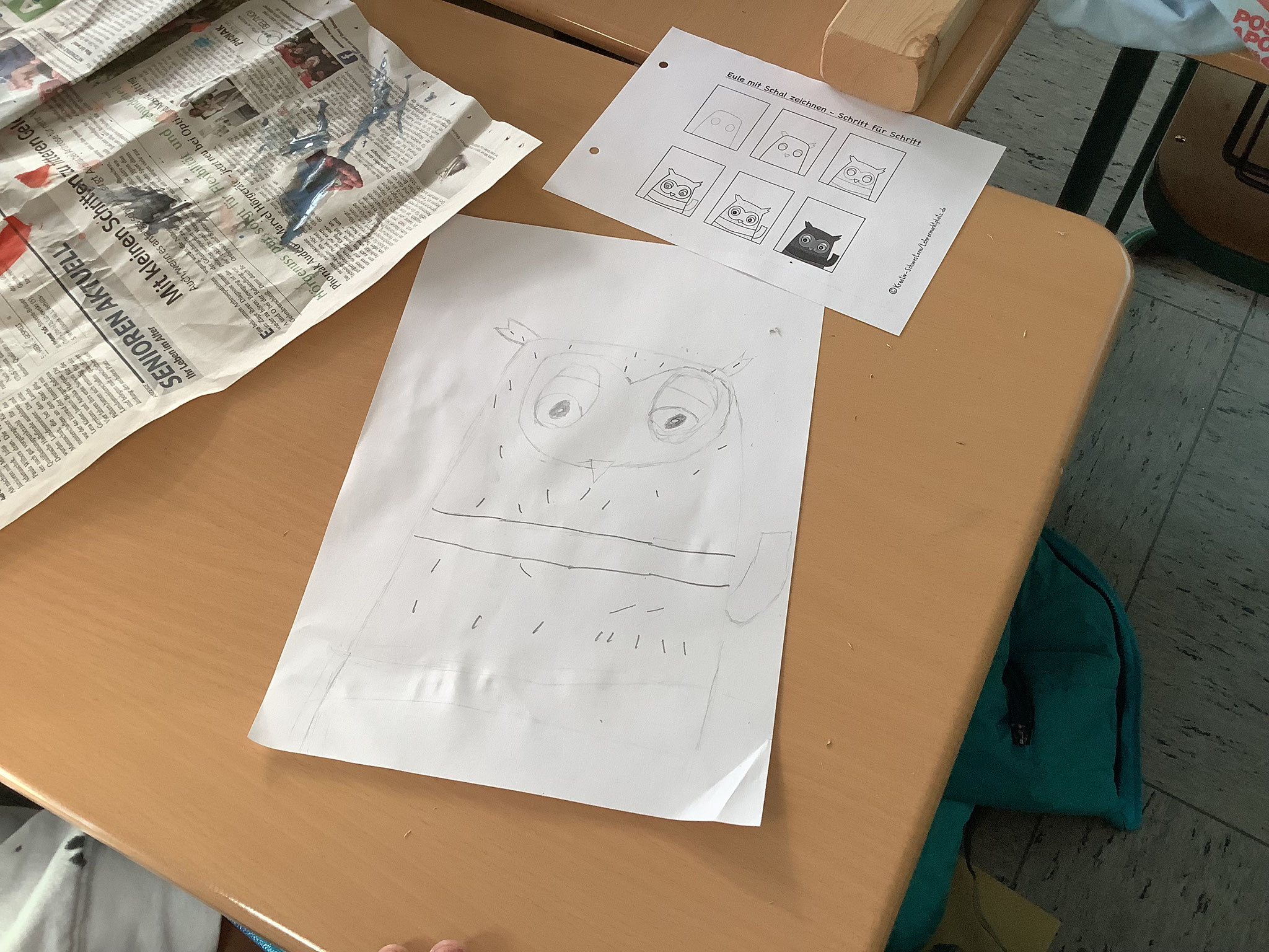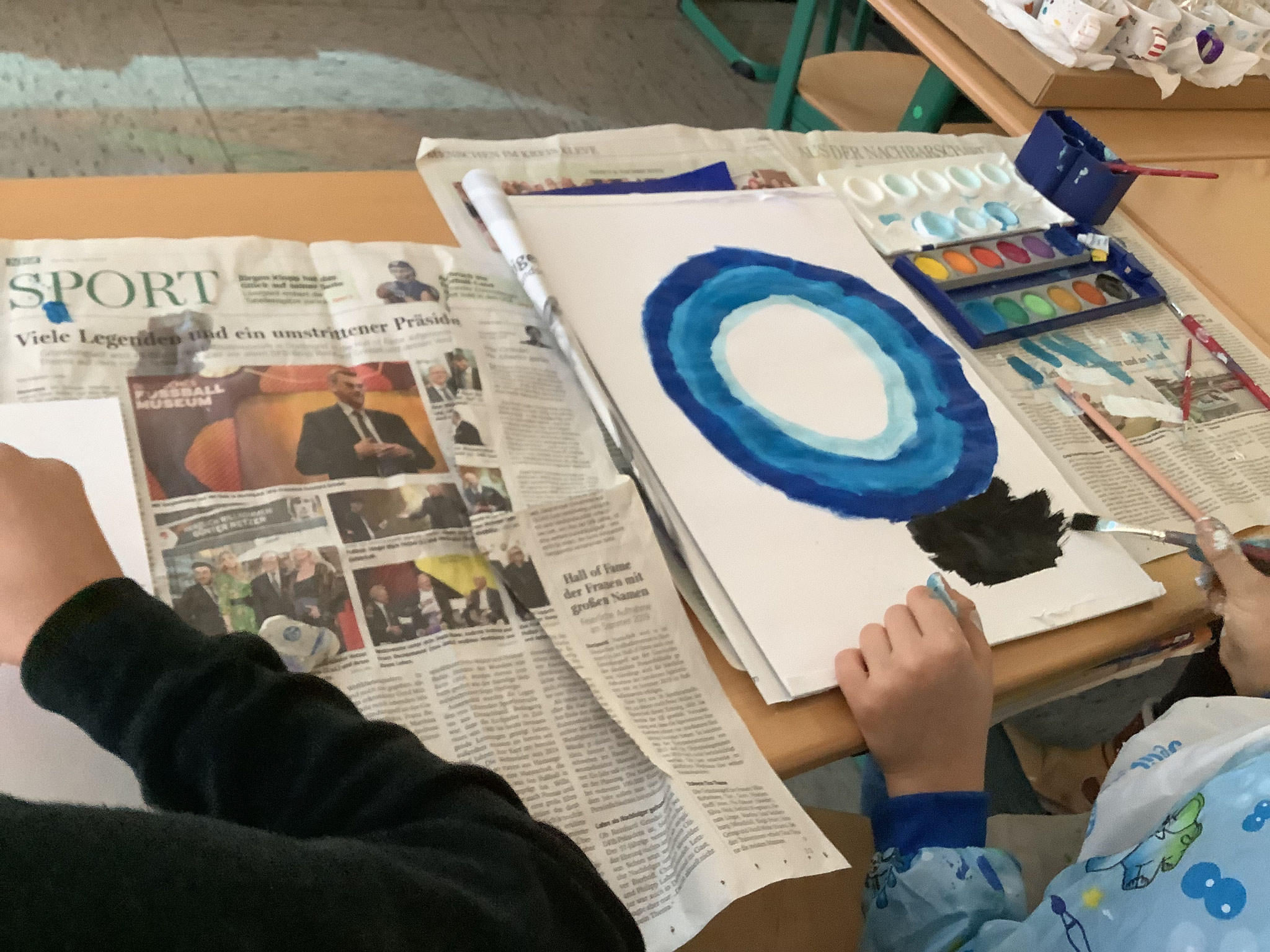 In der letzten Unterrichtswoche vor den Weihnachtsferien haben wir schöne Bilder mit Wasserfarbe gestaltet. Die Kinder haben unterschiedliche blaue Farbtöne und schwarze Farbe benutzt um den Nachthimmel rund um den Mond darzustellen. Nach einer Zeichenanleitung haben sie Tiere gezeichnet, farbig gestaltet und im Anschluss daran die Konturen mit einem schwarzen Filzstift umrandet. Die Kinder sind sehr stolz auf ihre Ergebnisse.