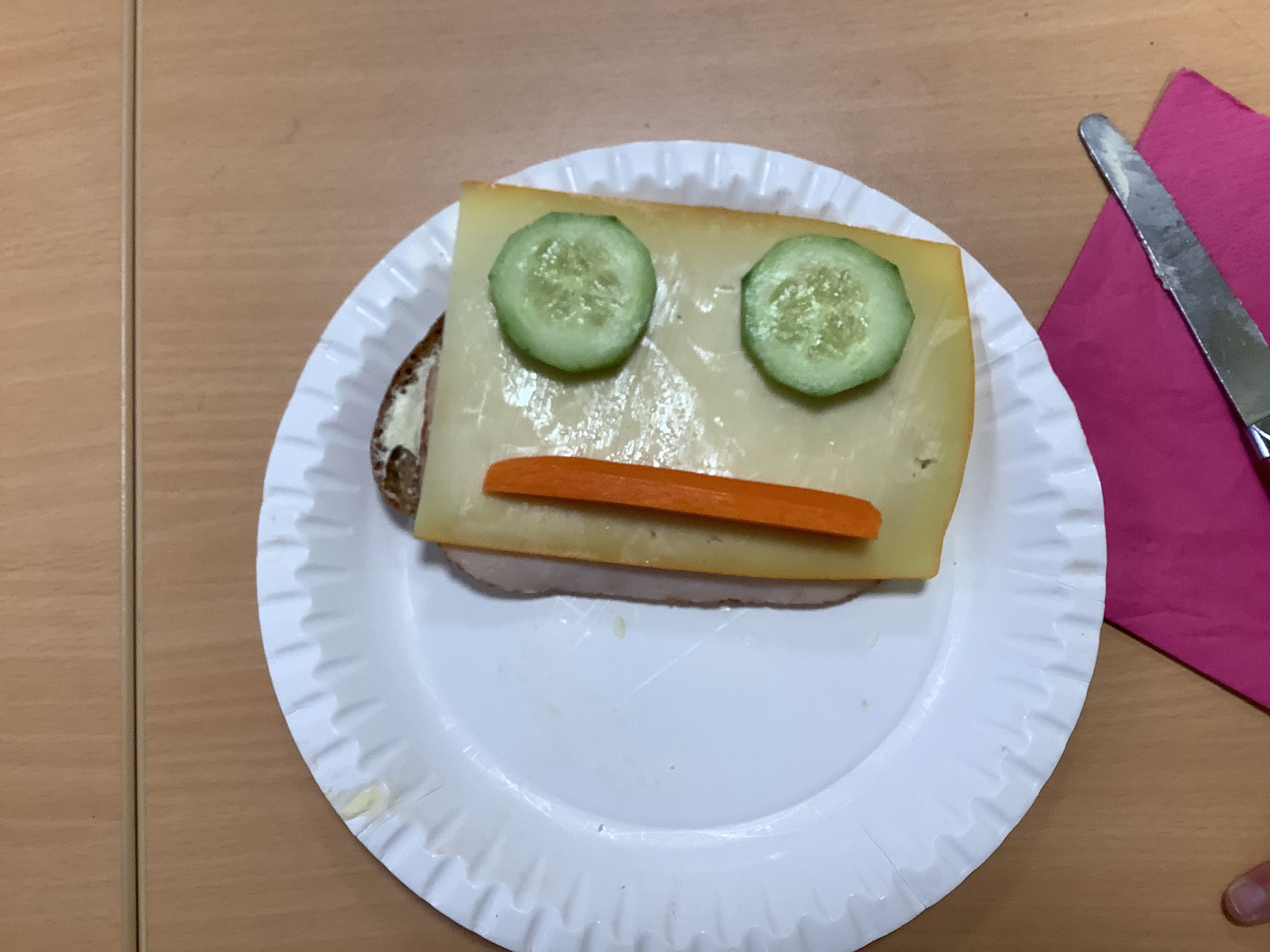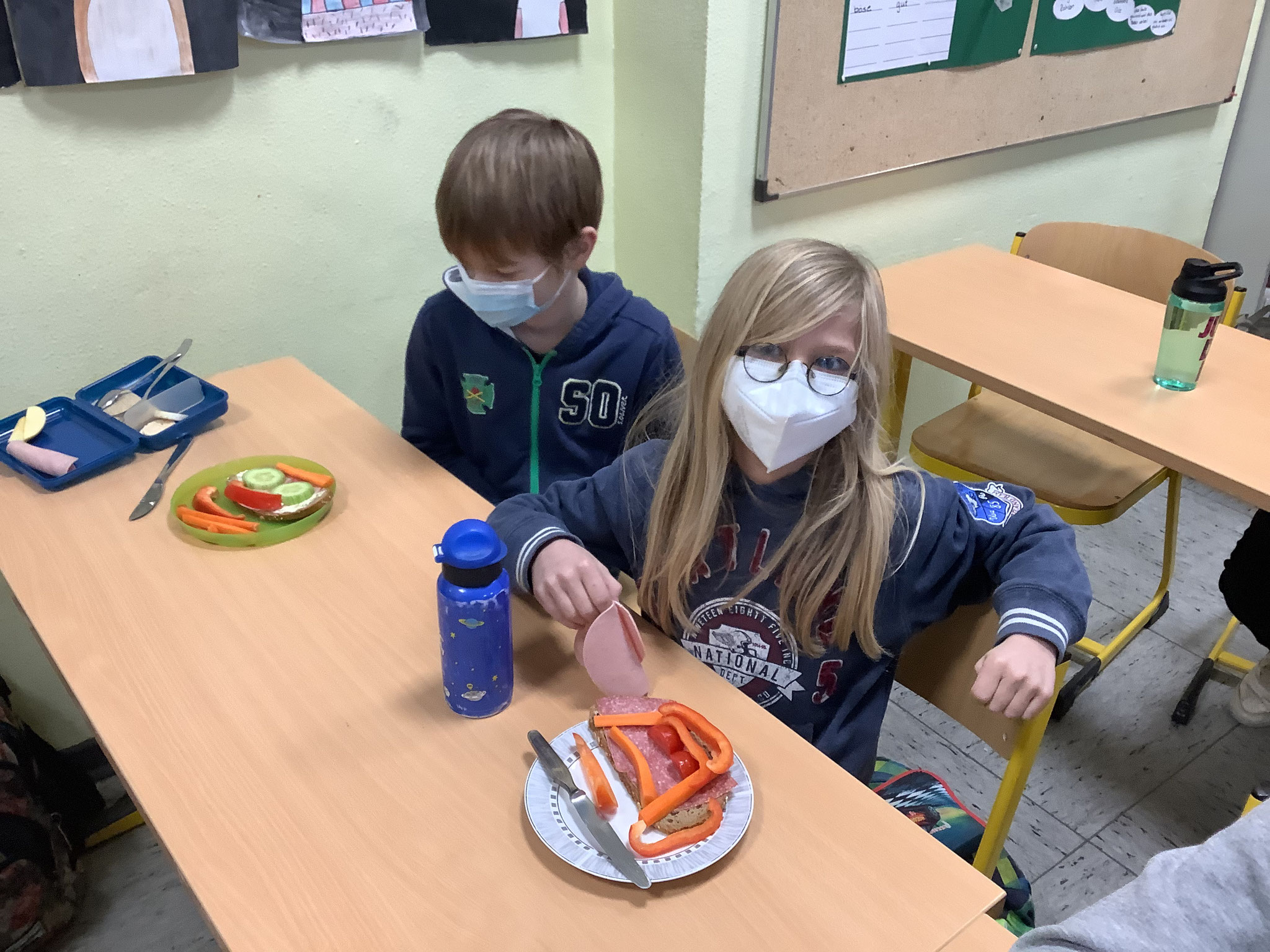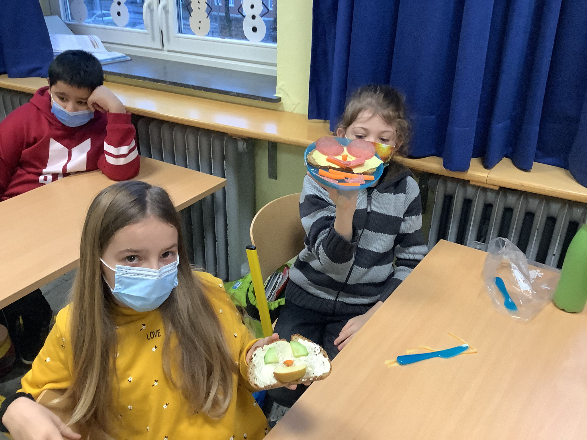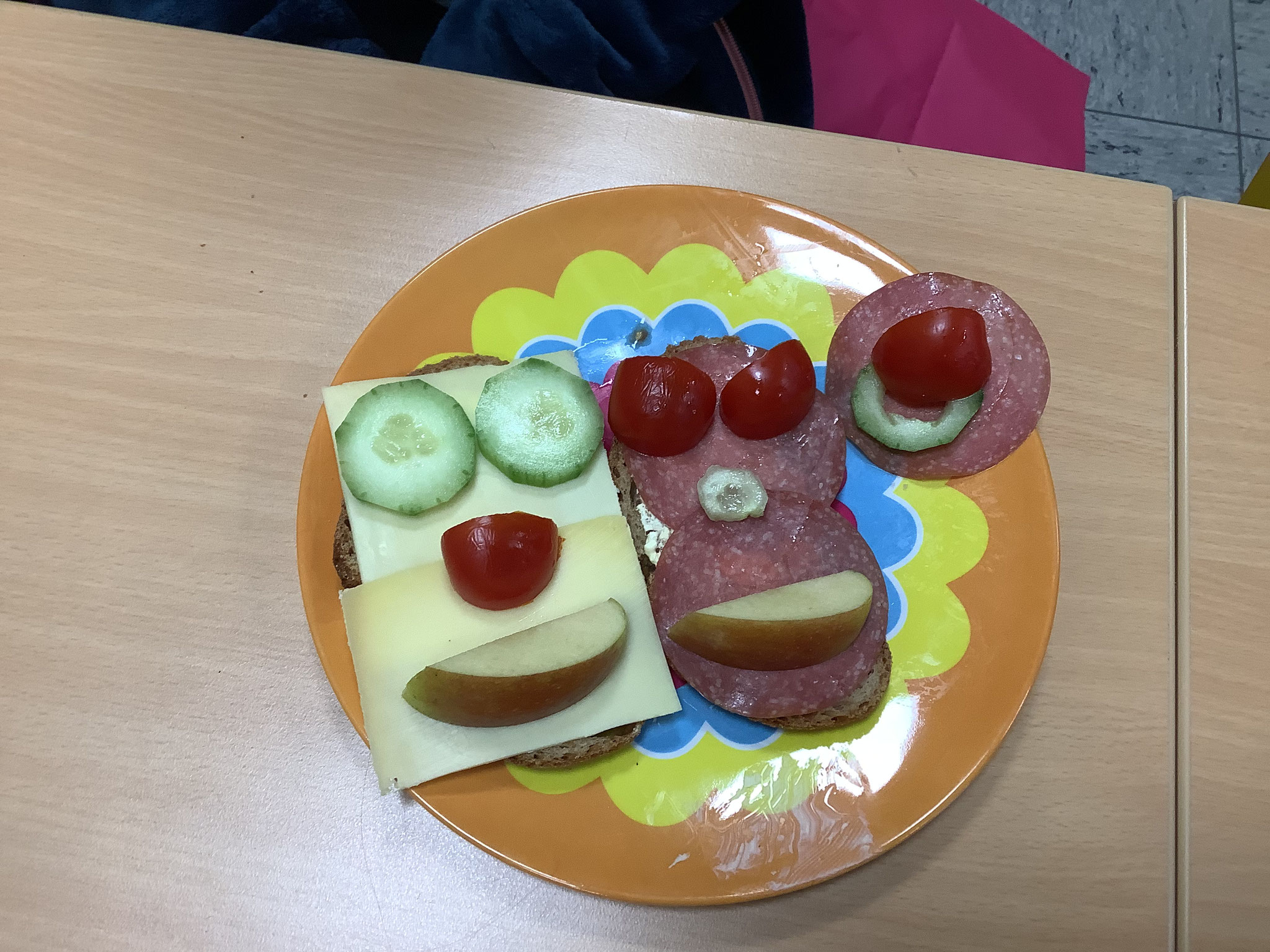 Am Gesundheitstag haben wir gemeinsam in der Klasse 4b gefrühstückt. Es gab frisches Brot, Käse, Aufschnitt, Obst und Gemüse. Daraus haben wir leckere Brotgesichter gemacht. Sehr lecker, es hat