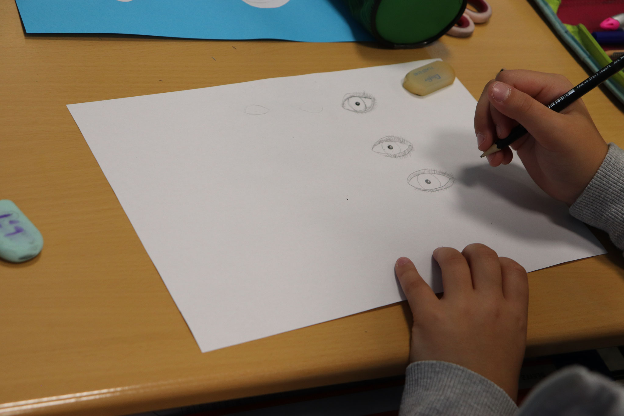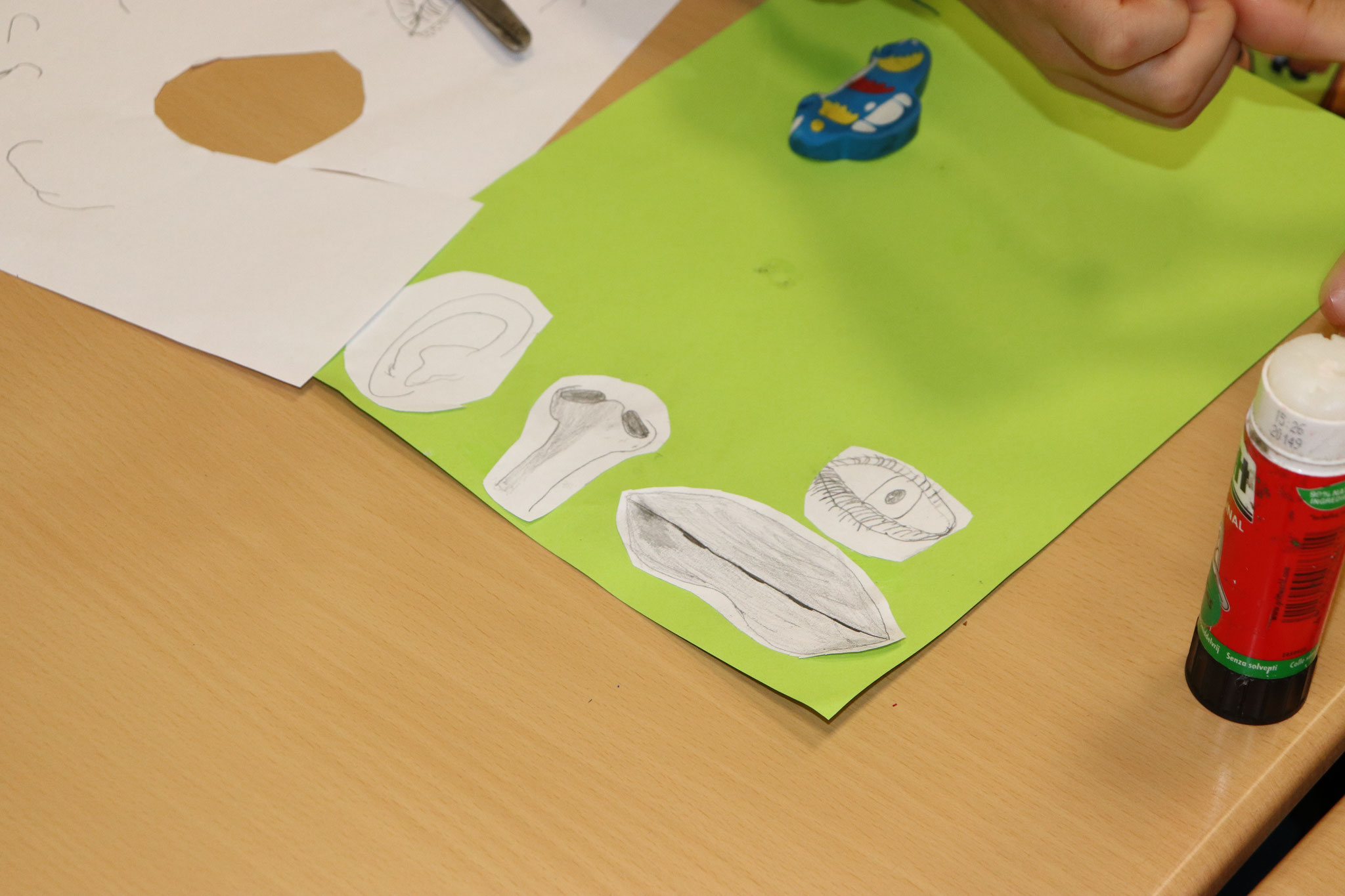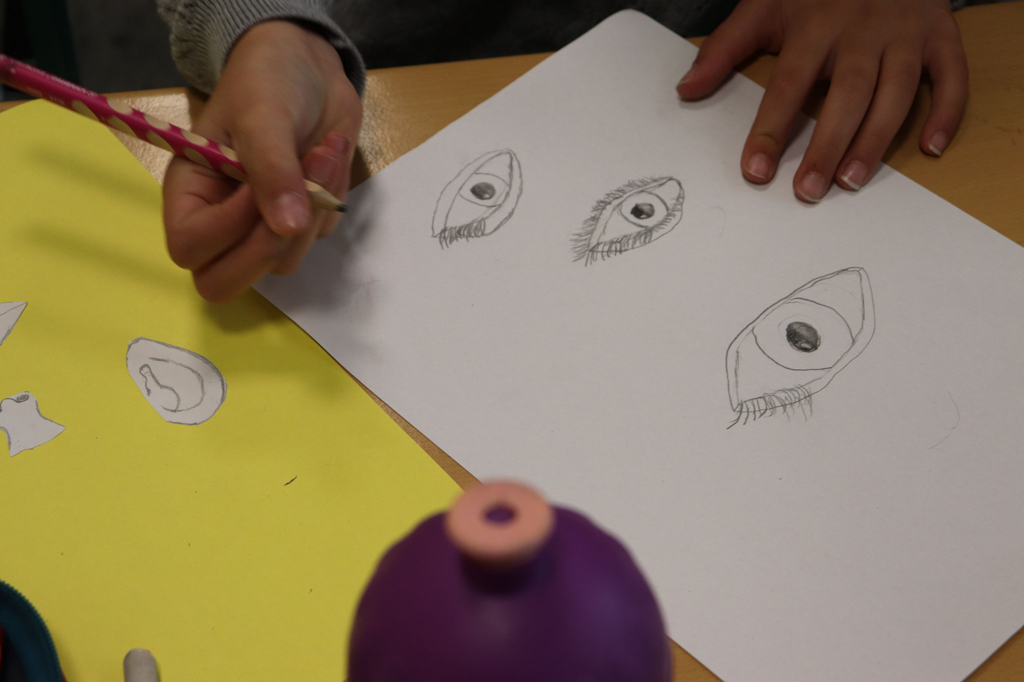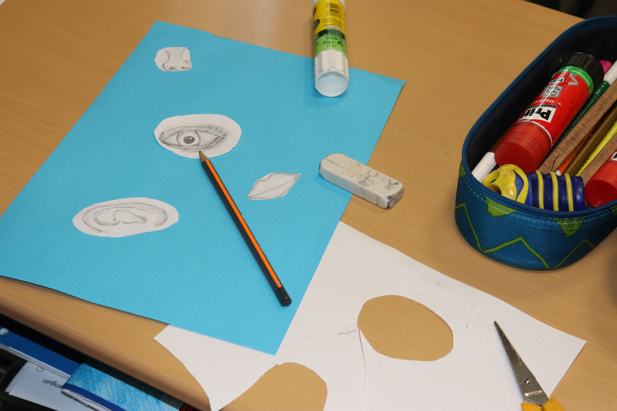 Augen, Nasen, Münder und die weiteren Teile des Kopfes zu zeichnen ist gar nicht so leicht. Eifrig haben die Kinder der Klasse 4a im Kunstunterricht einen Zeichenkurs gemacht. Nach und nach wurden so die verschiedenen Teile gezeichnet. Besonders wichtig war uns dabei, dass der Bleistift nicht zu fest über das Papier geführt wird. So hinterlässt man nach dem Radieren auch keine unschönen Spuren. Alles sollte 2 oder 3 mal geübt werden. Dann sollten die Kinder sich für ihre beste Zeichnung entscheiden. Diese wurde im Anschluss ausgeschnitten und auf ein buntes Blatt geklebt. Manche Kinder hatten die Idee, die Teile direkt so aufzukleben, dass ein Gesicht entsteht. Die Ergebnisse können sich auf jeden Fall sehen lassen.