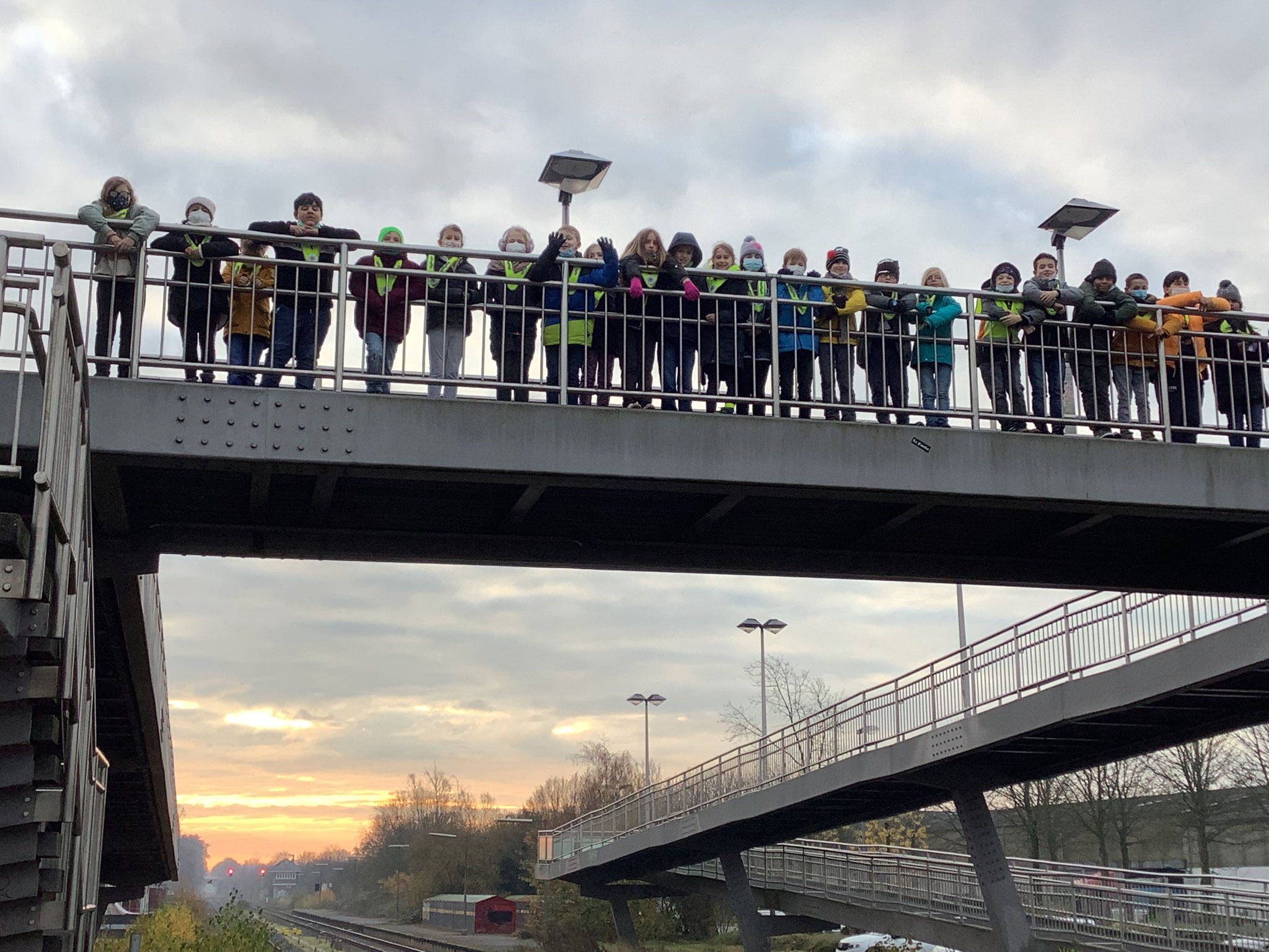Im Anschluss an die Unterrichtsstunde durften wir gemeinsam zum Bahnhof laufen. Dort zeigte uns Frau Ebers alle Verkehrsschilder und erklärte uns, wie wir sicher die Bahngleise überqueren müssen.