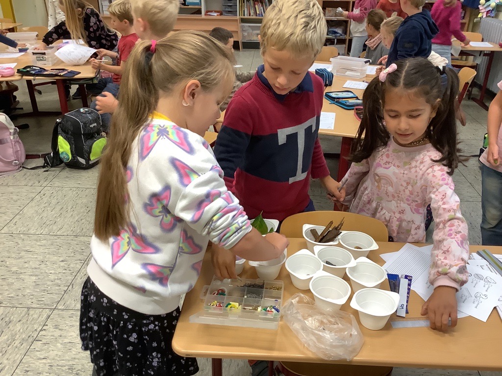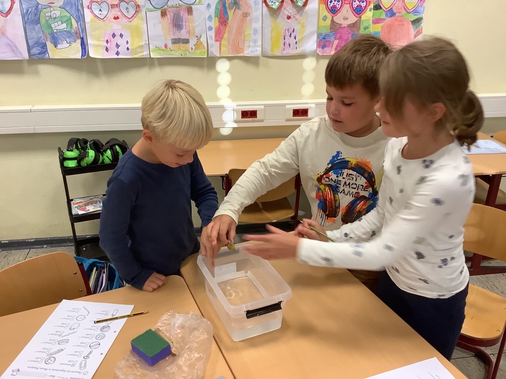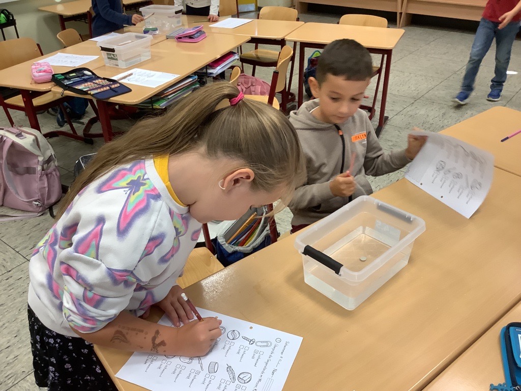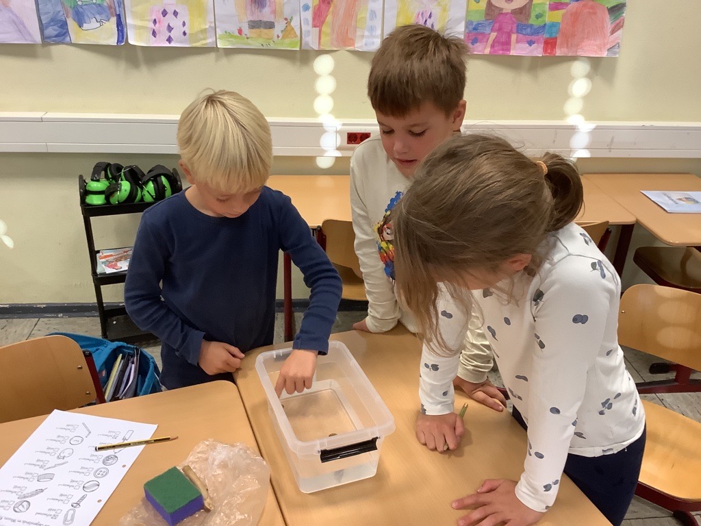 Die Kinder der zweiten Klassen testen anhand vieler Gegenstände, ob diese schwimmen oder sinken. Materialien können bei gleicher Größe ein unterschiedliches Gewicht haben. Ob ein Körper schwimmt oder sinkt, hängt vom Material ab. Materialien, die eine höhere Dichte haben, also bei gleichem Volumen schwerer sind als Wasser, sinken (z.B. Stein, Metall, Glas…). Gegenstände die eine geringere Dichte als das Wasser haben, schwimmen (z.B. Holz, Apfel…). Die Kinder der zweiten Klassen führen diese Versuche mit Begeisterung durch und können erste Ergebnisse darstellen und Regeln erkennen.